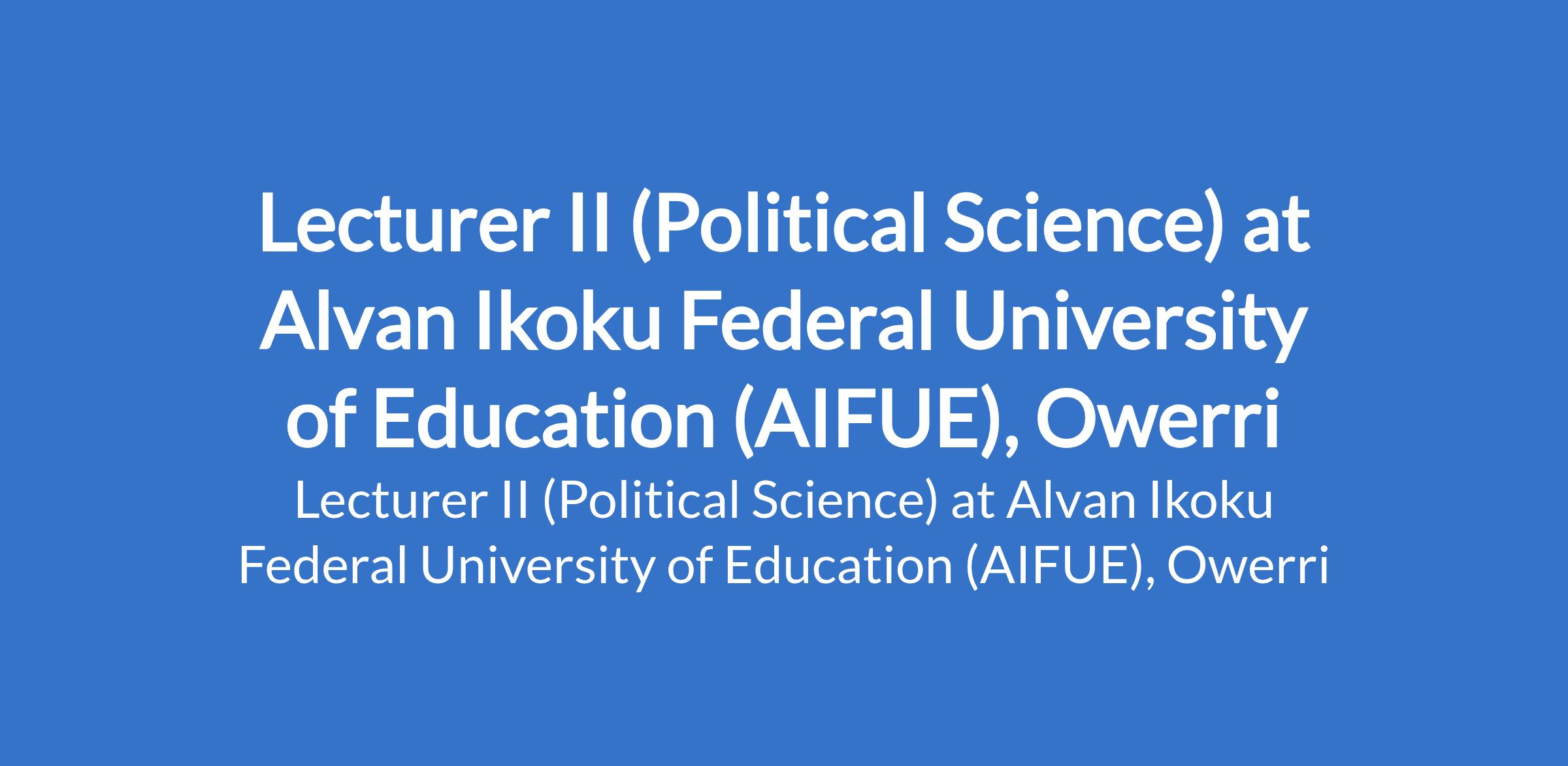 Alvan Ikoku Federal University of Education (AIFUE), Owerri invites applications from suitably qualified candidates for the position of: Lecturer II (Political Science). The position is located in Imo State. Interested candidates should possess minimum of a Master's Degree in the relevant field with a minimum of three (3) years as an Assistant Lecturer in a recognized university or a PhD in the relevant field.