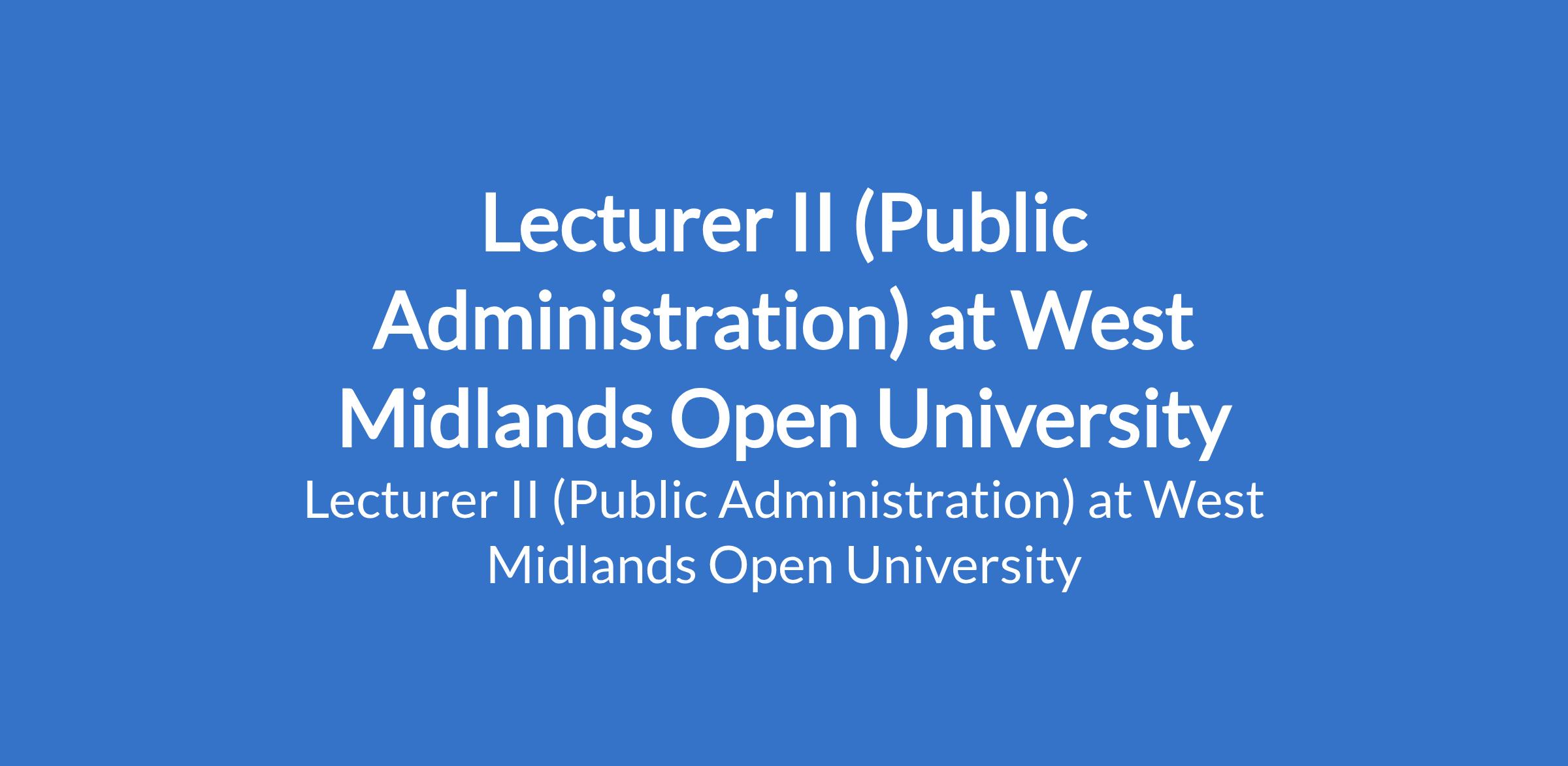 West Midlands Open University invites applications from suitable candidates to fill the position of: Lecturer II (Public Administration). The position is located in Ikeja, Lagos State. Interested candidates should possess a Ph.D Degree or at least, 3 years of teaching experience as Assistant Lecturer in addition to at least 4 points from recognized publications.