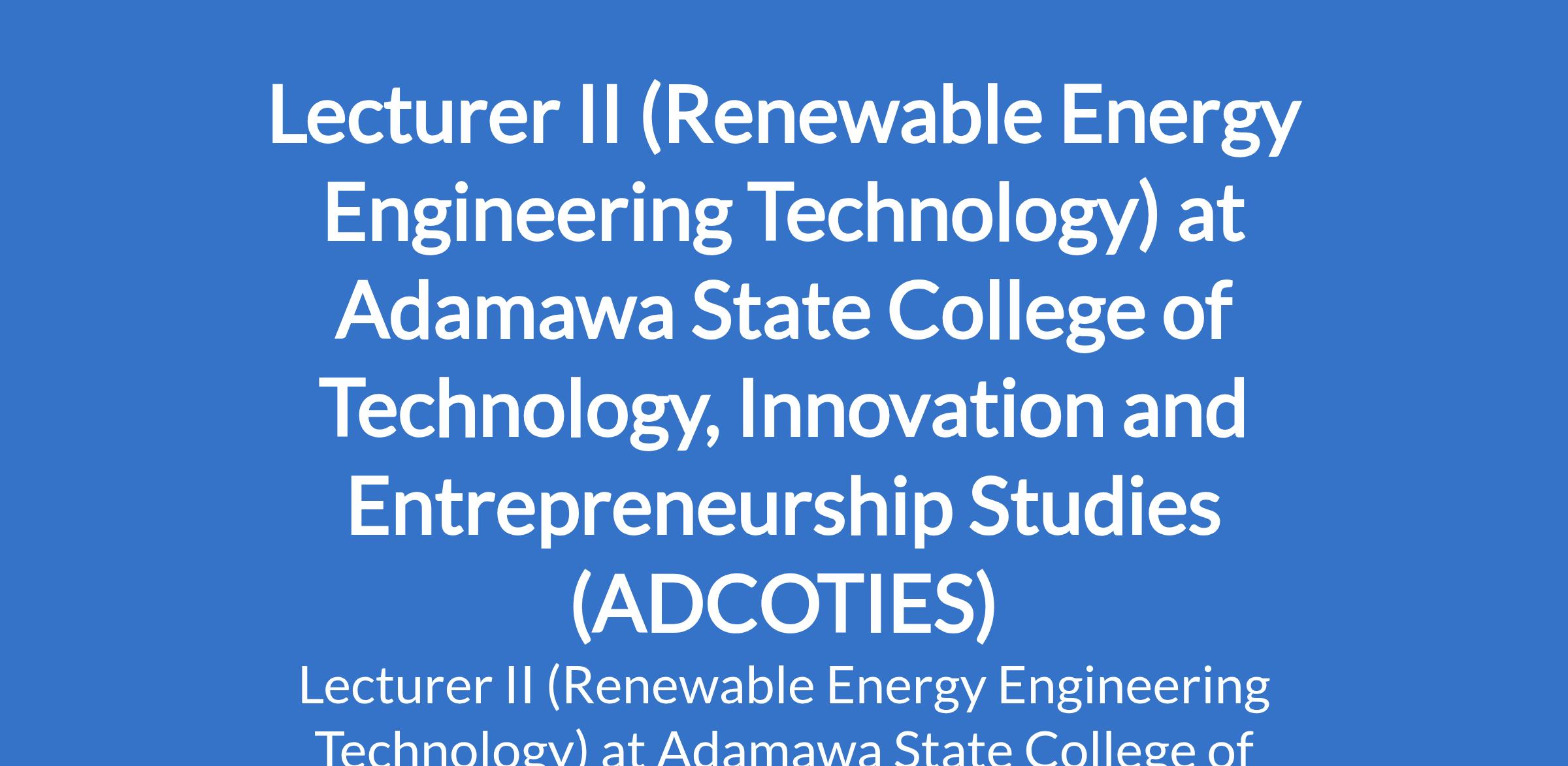 Adamawa State College of Technology, Innovation and Entrepreneurship Studies (ADCOTIES) is recruiting to fill the position of: Lecturer II (Renewable Energy Engineering Technology). The position is located in Gulak, Adamawa State. Interested candidates should possess a Master's Degree in relevant disciplines from a recognised institution plus at least 6 years teaching / research or industrial work experience with at least 3 conference/seminar papers and 1 journal publication plus NYSC discharge or exemption certificate; or a PhD Degree in relevant disciplines from a recognised institution with at least 3 conference / seminar papers and 3 journal publications.