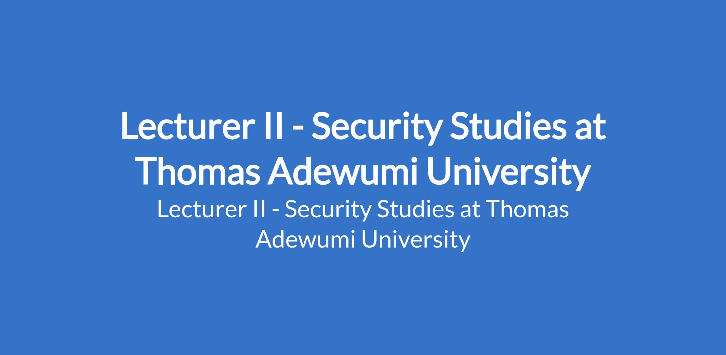 Thomas Adewumi University invites applications from suitable candidates to fill the position of: Lecturer II - Security Studies. The position is located in Kwara State. Interested candidates should possess a Ph.D. in Security Studies, Criminology, Criminal Justice, or a closely related field with three to five years of teaching experience at the university level.