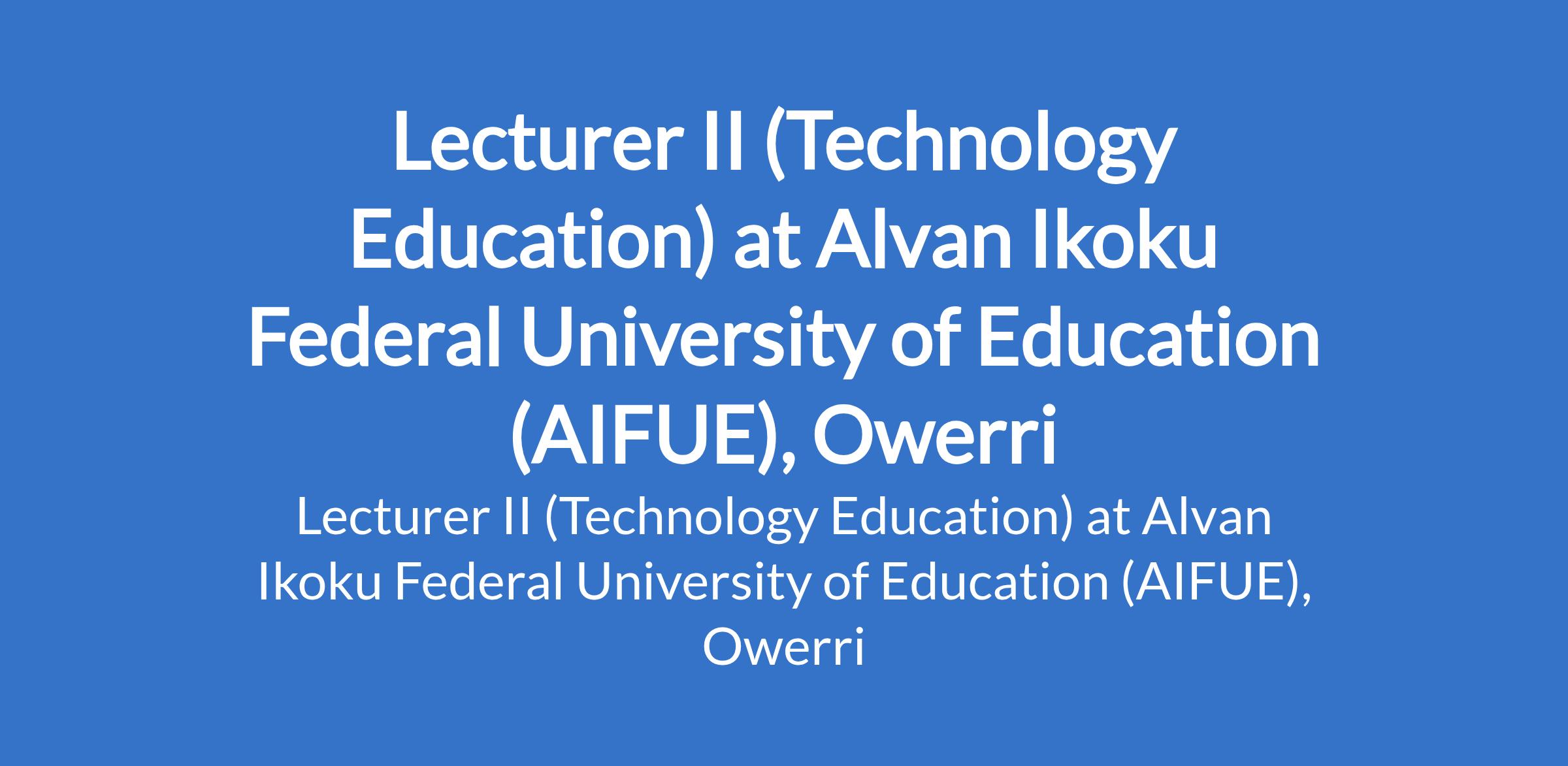 Alvan Ikoku Federal University of Education (AIFUE), Owerri invites applications from suitably qualified candidates for the position of: Lecturer II (Technology Education). The position is located in Imo State. Interested candidates should possess minimum of a Master's Degree in the relevant field with a minimum of three (3) years as an Assistant Lecturer in a recognized university or a PhD in the relevant field.