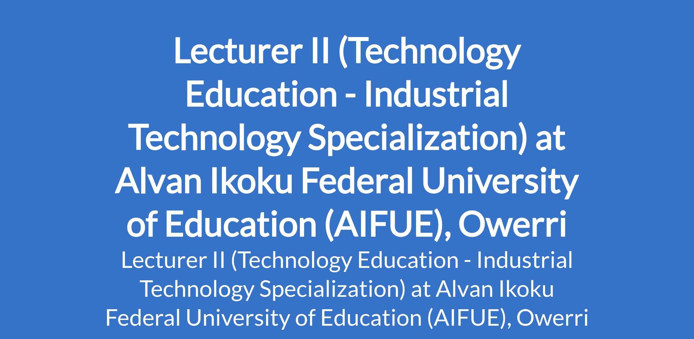 Alvan Ikoku Federal University of Education (AIFUE), Owerri invites applications from suitably qualified candidates for the position of: Lecturer II (Technology Education - Industrial Technology Specialization). The position is located in Imo State. Interested candidates should possess a minimum of Master's Degree in the relevant field with at least three (3) years as an Assistant Lecturer in a recognized university or a PhD in the relevant field.