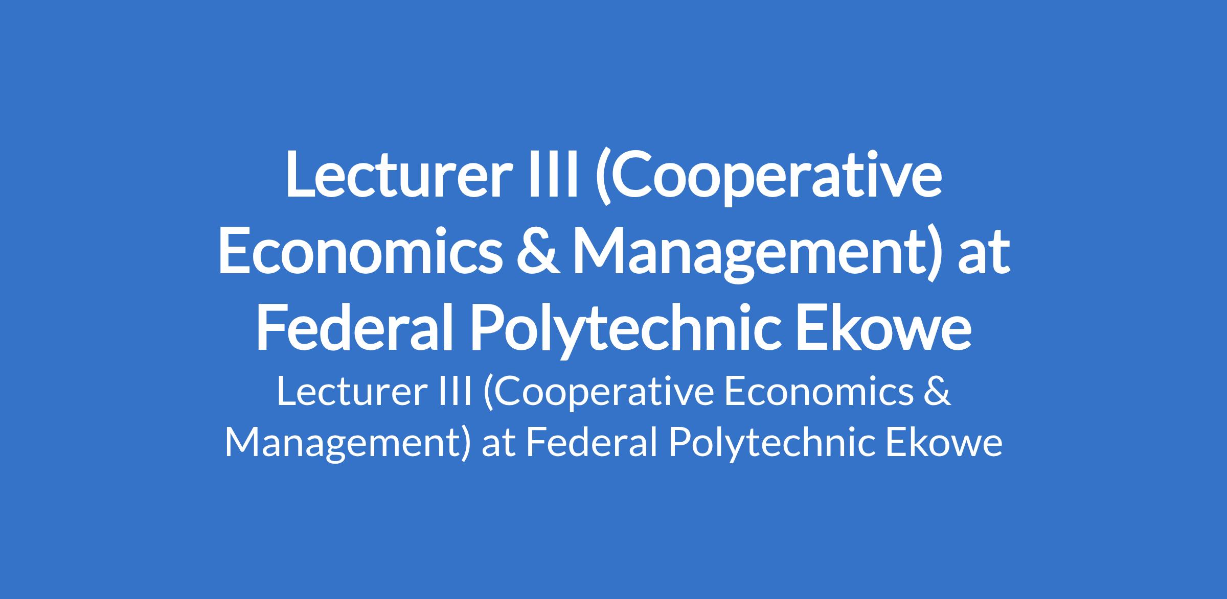 Federal Polytechnic Ekowe invites applications from suitably qualified candidates for the position of: Lecturer III (Cooperative Economics & Management). The position is located in Bayelsa State. Interested candidates should possess a Master's Degree in the relevant field from a recognized institution with NYSC certificate.