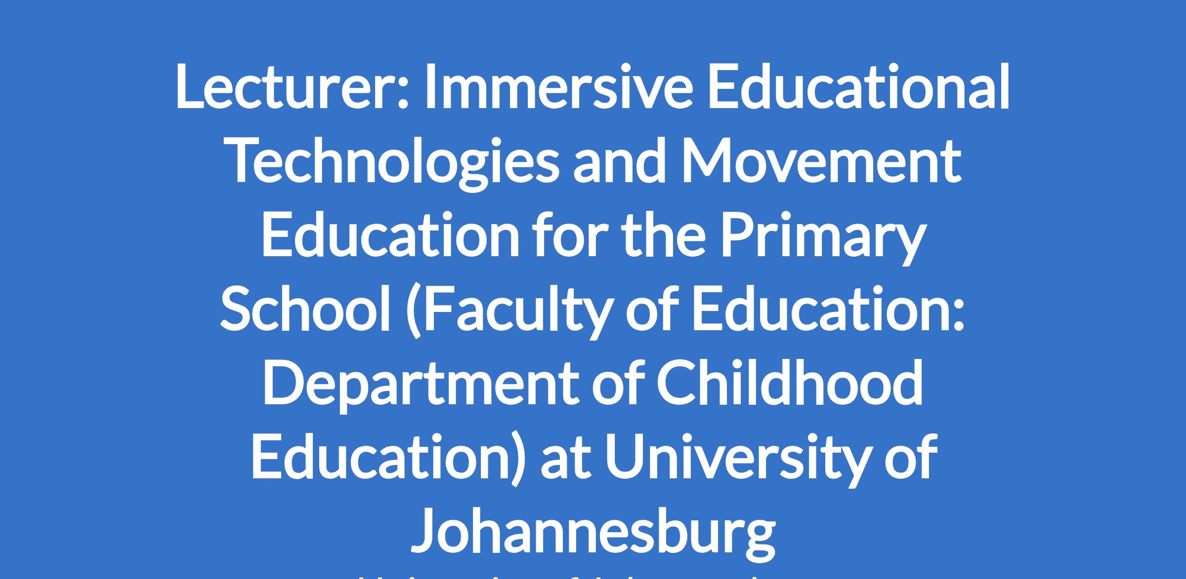 Lecturer: Immersive Educational Technologies and Movement Education for the Primary School (Faculty of Education: Department of Childhood Education) at University of Johannesburg