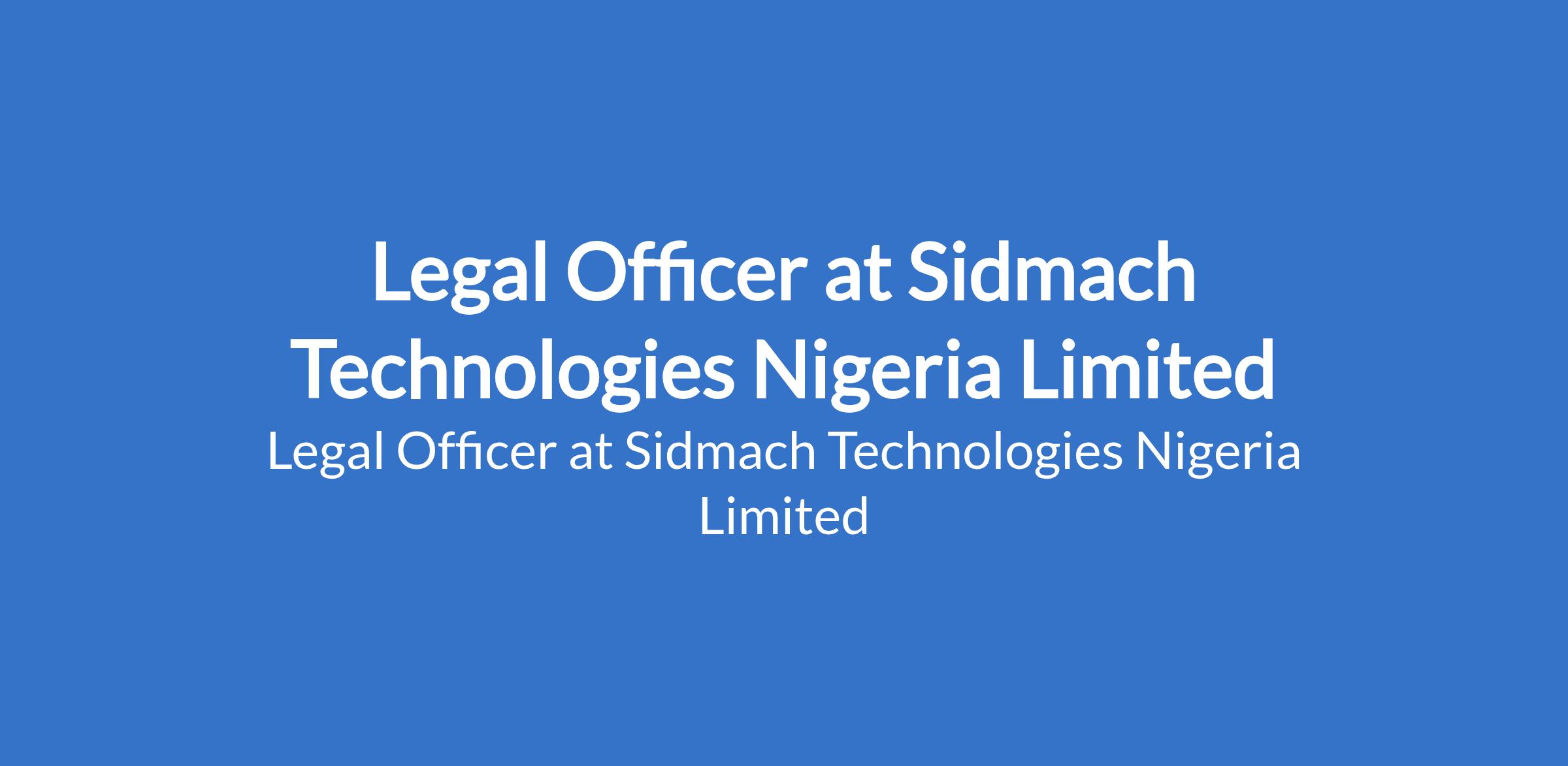 Sidmach Technologies Nigeria Limited is recruiting to fill the position of: Legal Officer. The position is located in Alausa / Ikeja - Lagos State. Salary: N400,000 - N500,000 per month. Interested candidates should possess a minimum of LLB Degree with a minimum of 3 years experience in an active capacity.