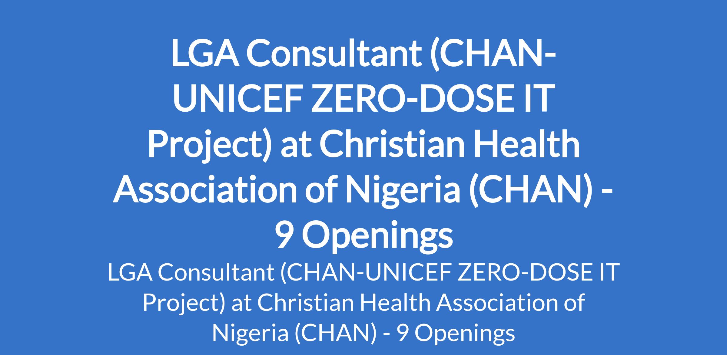 Christian Health Association of Nigeria (CHAN) is recruiting to fill the position of: LGA Consultant (CHAN-UNICEF ZERO-DOSE IT Project). The position is located in Abuja, Adamawa, Bauchi, Bayelsa, Kebbi, Lagos, Niger, Ogun and Ondo States. Interested candidates should possess a Degree in Public Health, Social Sciences, or CHO/CHEW with reasonable field experience with 3 - 5 years field experience in community mobilization and ACSM activities.
