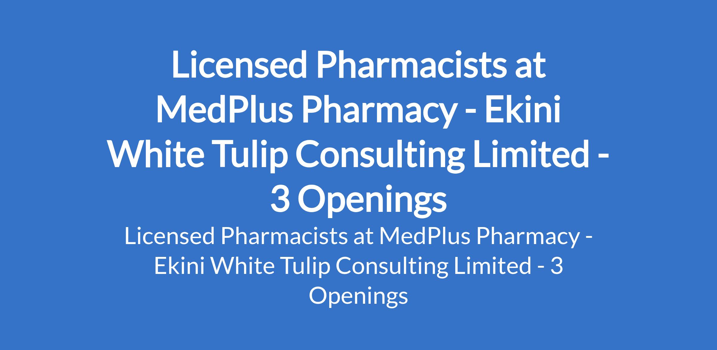 Ekini White Tulip Consulting Limited - Our client, MedPlus Pharmacy is recruiting to fill the position of: Licensed Pharmacist. The position is located in Lagos Island, Yaba and Iju - Ishaga, Lagos State. Salary: N320,000 / month. Interested candidates should possess a B.Pharm or PharmD, a valid PCN License & NYSC Discharge Certificate with passion for patient care & excellence in service.