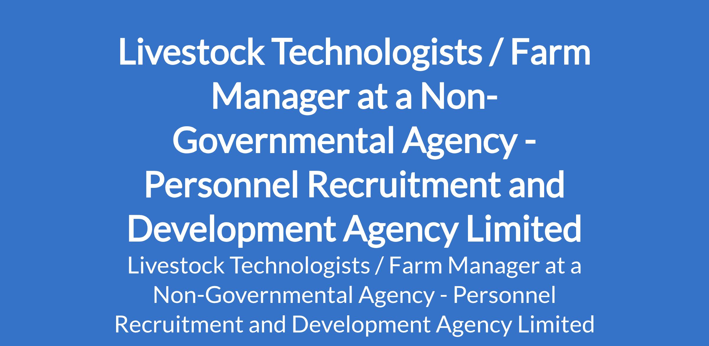 Personnel Recruitment and Development Agency Limited, on behalf of a Non-Governmental Agency, is recruiting to fill the position of: Livestock Technologist / Farm Manager. The position is located in Ijebu Ode, Ogun State. Interested candidates should possess a minimum of an HND qualification in Animal Production or Animal Production Technology with 3 years of relevant work experience.