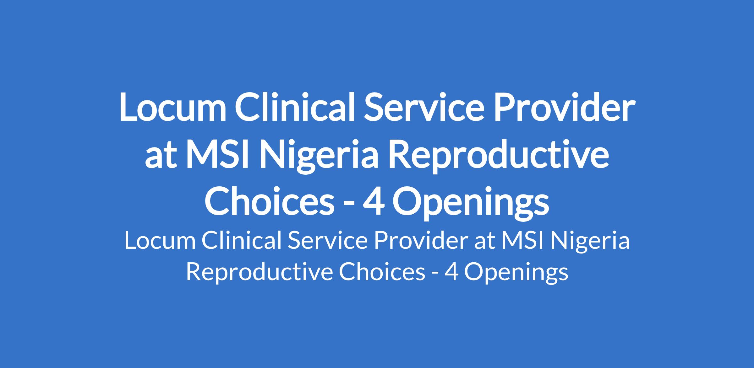 MSI Nigeria Reproductive Choices is recruiting to fill the position of: Locum Clinical Service Provider. The position is located in Abuja (FCT), Edo, Lagos, and Rivers States. Interested candidates should possess a BCLS certification with a minimum of 3 years post-graduation experience in a Midwifery position in an established healthcare system.