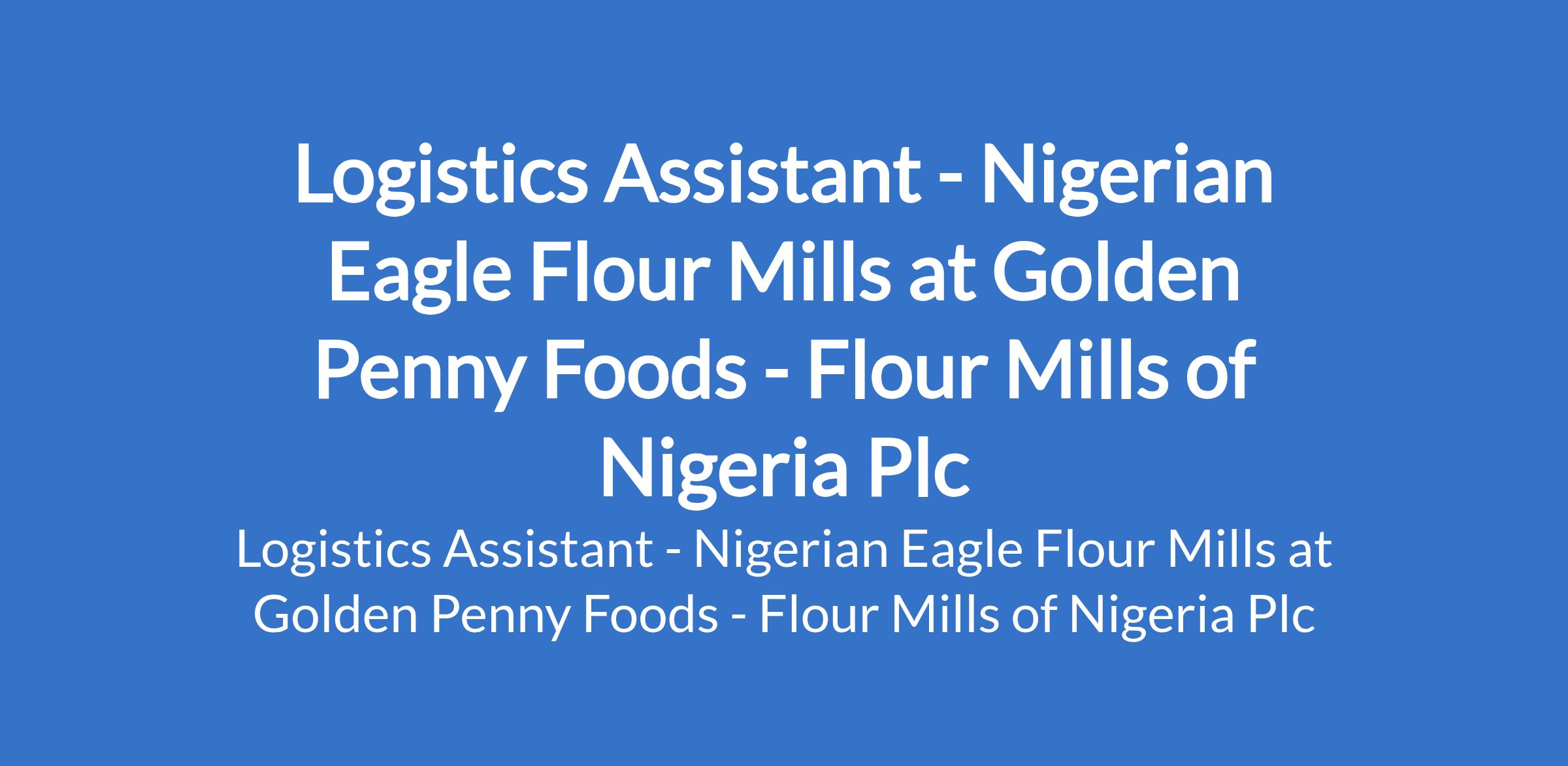 Golden Penny Foods, a subsidiary of Flour Mills of Nigeria Plc is recruiting to fill the position of: Logistics Assistant - Nigerian Eagle Flour Mills. Interested candidates should possess a Diploma / OND in a related field with 13 years experience in logistics, supply chain, or dispatch operations.