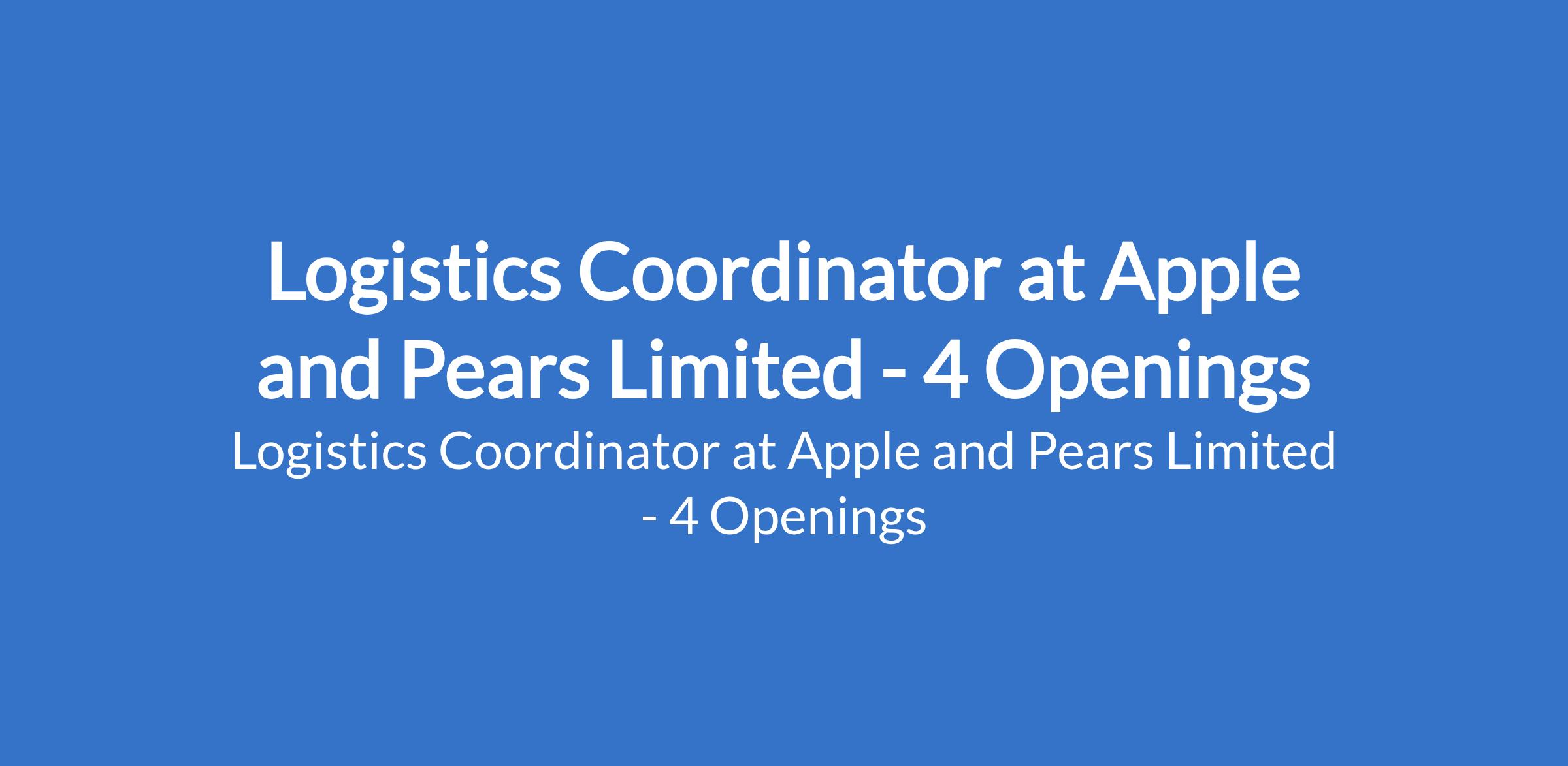 Apple and Pears Limited is recruiting to fill the position of: Logistics Coordinator. The position is located in Abuja (FCT), Enugu, Kano, and Port Harcourt - Rivers States. Salary: N150,000 monthly. Interested candidates should possess a Bachelors Degree or HND qualification in Logistics, Supply Chain Management, Business Administration, or a related field with 2 - 3 years of relevant experience in logistics coordination or a similar role, and must be able to resume on short notice.