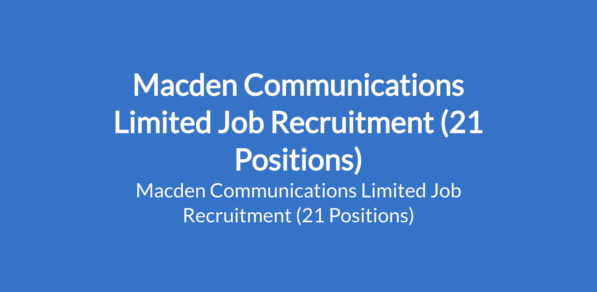 Macden Communications Limited is recruiting suitably qualified candidates to fill the following positions in Lagos, Anambra, Imo, and Rivers States: Cashier (Female), Supervisor, Supervisor for Easterners, Female Invoicer, Storekeeper, Supervisor, Forklift Operator, Telesales Officer, Resident Accountant, Resident Accountant, Telesales Representative (Real Estate), Sales, Purchase and Stocks Inventory Supervisor, Driver (Mini Trucks and Vans) - Warehouse, Inventory Supervisor, Resident Accountant, Customer Care Service Representative, and Loader / Motor Boy.