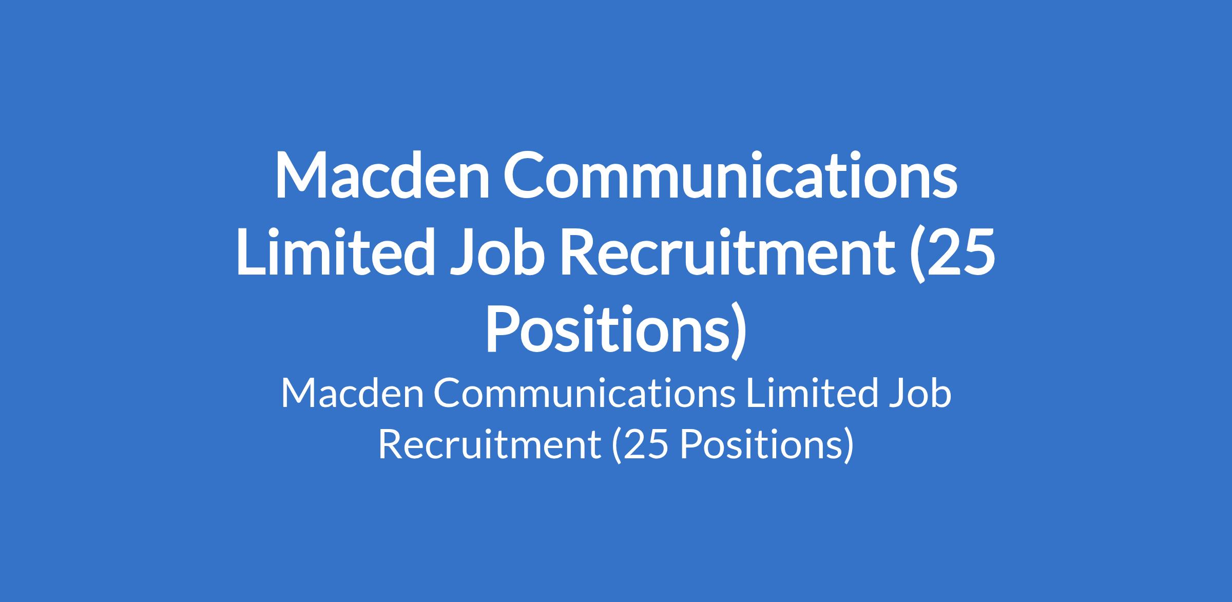 Macden Communications Limited is recruiting suitably qualified candidates to fill the following positions in Lagos, Anambra, Imo, and Rivers States: Driver (6 Tyres Truck), Supervisor, Supervisor for Easterners, Cashier (Female), Female Invoicer, Storekeeper, Supervisor, Forklift Operator, Telesales Officer, Resident Accountant, Resident Accountant, Telesales Representative (Real Estate), Sales, Purchase and Stocks Inventory Supervisor, Driver (Mini Trucks and Vans) - Warehouse, Inventory Supervisor, Resident Accountant, Customer Care Service Representative, and Loader / Motor Boy.