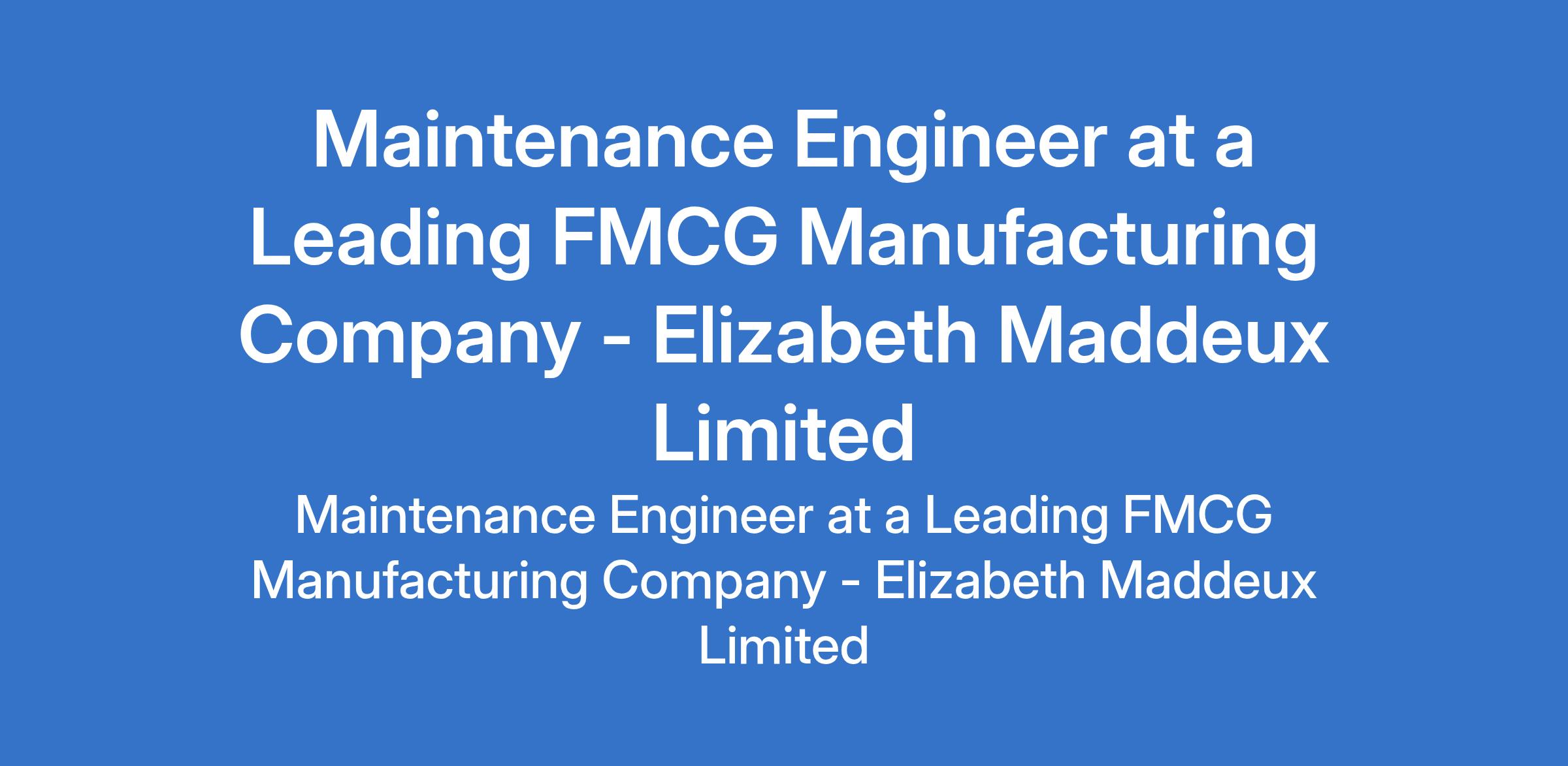 Elizabeth Maddeux Limited - Our client, a leading FMCG manufacturing company is recruiting to fill the position of: Maintenance Engineer. The position is located in Abuja (FCT). Salary: N200,000 - N300,000 / month. Interested candidates should possess a Bachelors Degree in Mechanical, Electrical, Industrial Engineering or related field with minimum 4 years experience in maintenance engineering in FMCG, manufacturing, or heavy industry.