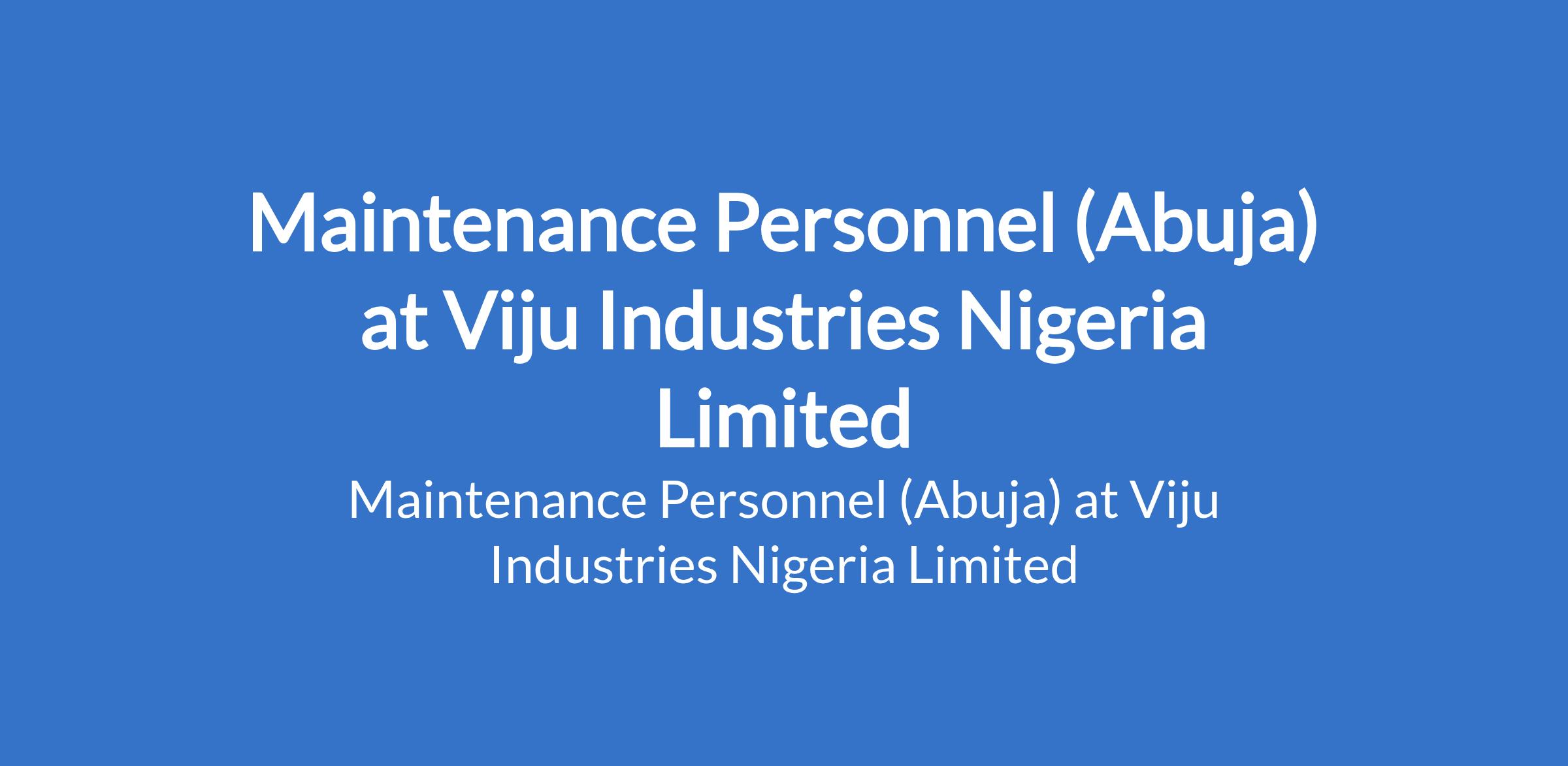 Viju Industries Nigeria Limited is recruiting to fill the position of: Maintenance Personnel. The position is located in Kwali, Abuja (FCT). Salary: N100,000 - N300,000 / month. Interested candidates should possess relevant qualifications with experience.