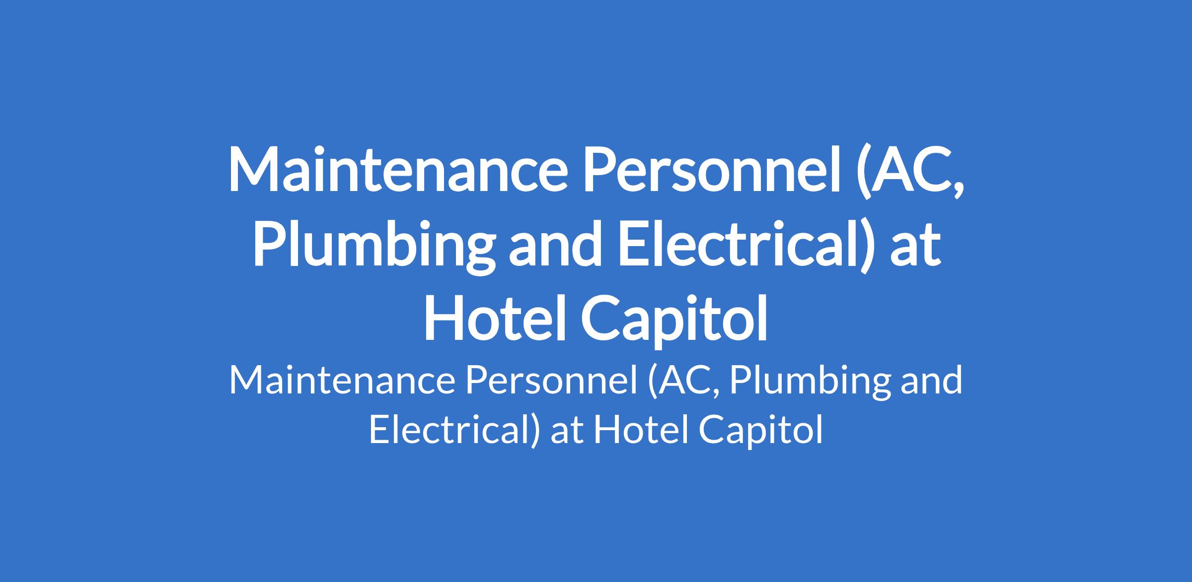 Hotel Capitol is recruiting to fill the position of: Maintenance Personnel (AC, Plumbing and Electrical). The position is located in Berger, Lagos State. Interested candidates should possess a Trade certificate or Diploma in Electrical, Plumbing, HVAC, or related fields with a minimum of 2 years of experience in hotel or commercial building maintenance.