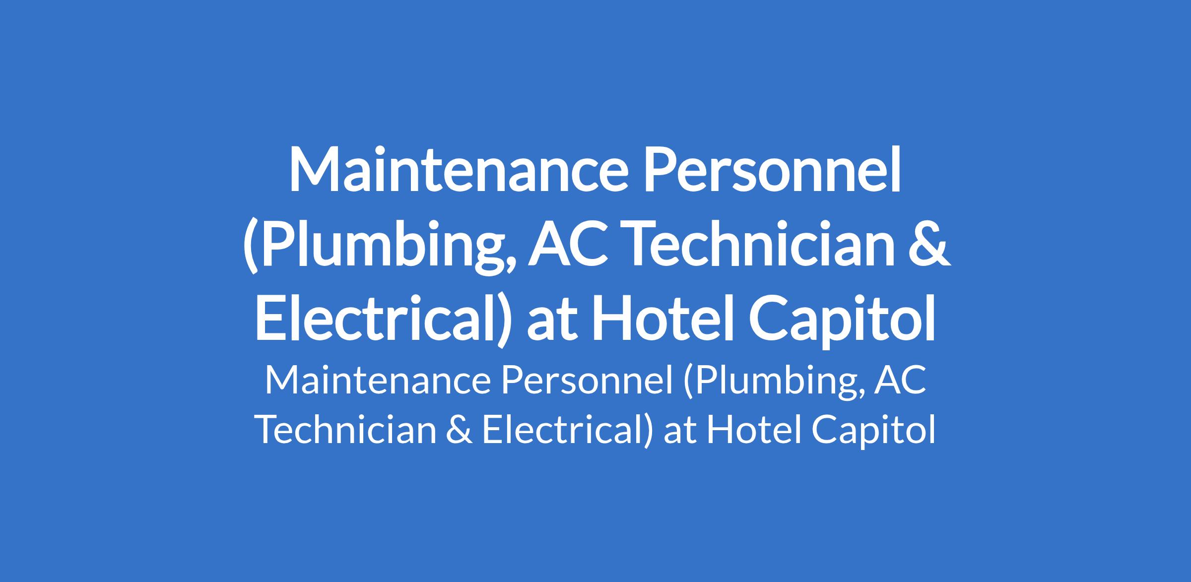Hotel Capitol is recruiting to fill the position of: Maintenance Personnel (Plumbing, AC Technician & Electrical). The position is located in Berger, Lagos State. Interested candidates should possess a Trade certificate or Diploma in Electrical, Plumbing, HVAC, or related fields with a minimum of 2 years of experience in hotel or commercial building maintenance.