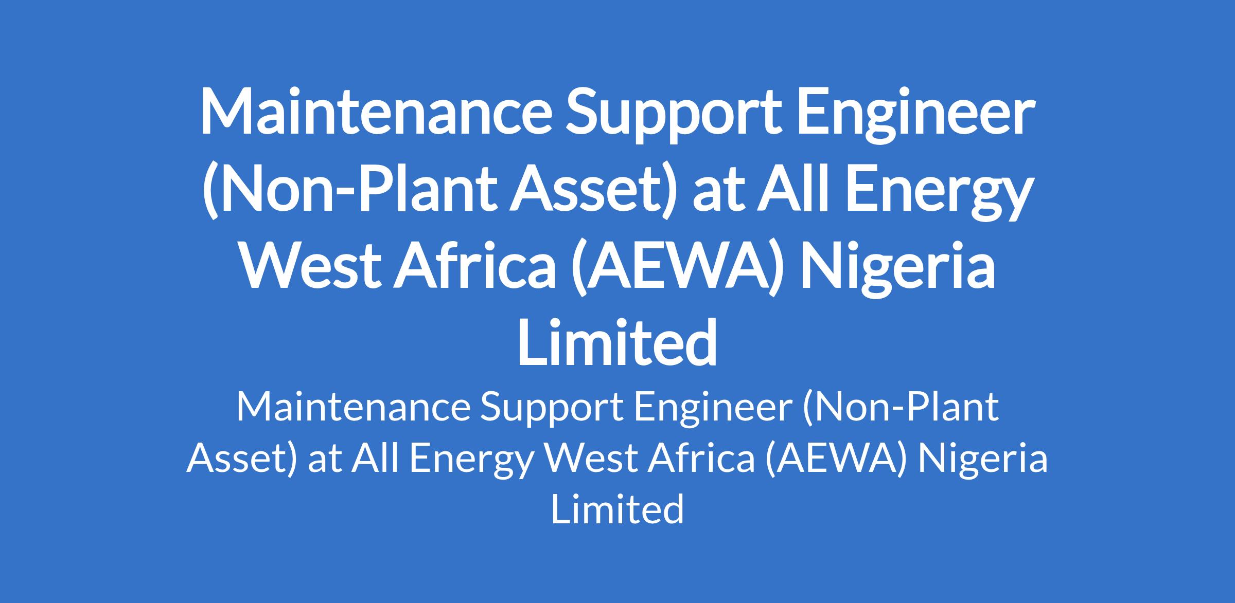 All Energy West Africa (AEWA) Nigeria Limited is recruiting to fill the position of: Maintenance Support Engineer (Non-Plant Asset). The position is located in Rivers State. Interested candidates should possess a B.Eng. / B.Sc. Degree or equivalent in appropriate related Engineering discipline (Civil, Mechanical, Electrical, or Reliability) with a minimum of 5 years post-graduation experience in engineering and/or maintenance, with planning and scheduling skills.