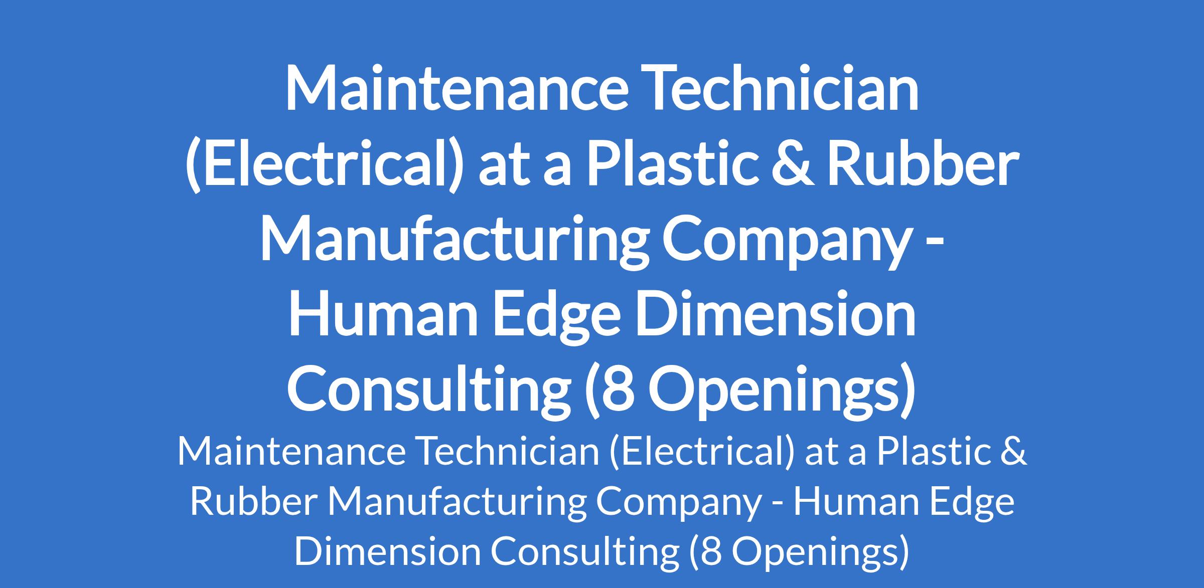 Human Edge Dimension Consulting - Our client, plastic & rubber manufacturing company is recruiting to fill the position of: Maintenance Technician (Electrical). The position is located in Sulurele, Lagos State. Salary: N200,000 - N400,000 per month. Interested candidates should possess an OND/ HND Engineering with 1-3 yrs experience in electrical maintenance in manaufacturing operations.