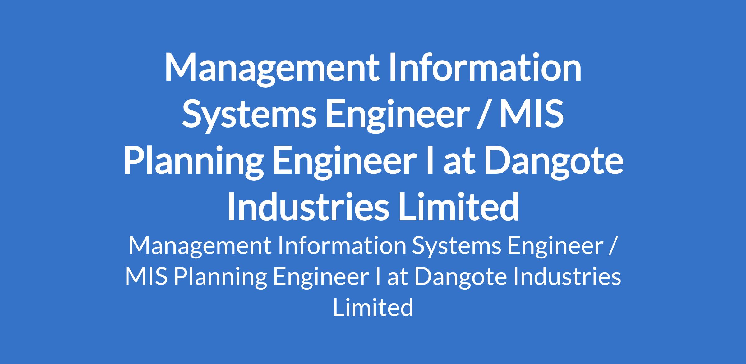 Dangote Industries Limited is recruiting to fill the position of: Management Information Systems Engineer / MIS Planning Engineer I. Interested candidates should possess a Masters Degree in Industrial Engineering / Management Information Systems (MIS) / Data Analysis / Statistics / Mechanical / Production Engineering with a minimum of 5 years experience in an industrial environment.