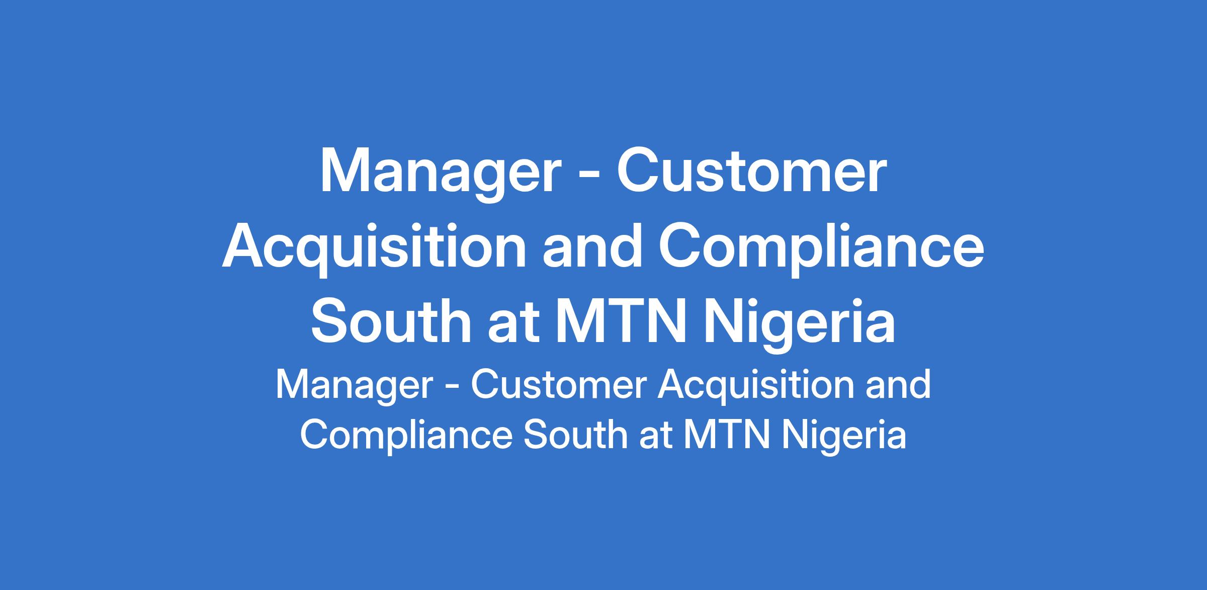 MTN Nigeria is recruiting to fill the position of: Manager - Customer Acquisition and Compliance South. The position is located in Port Harcourt, Rivers State. Interested candidates should possess a First Degree in any related discipline with 6 - 13 years experience.