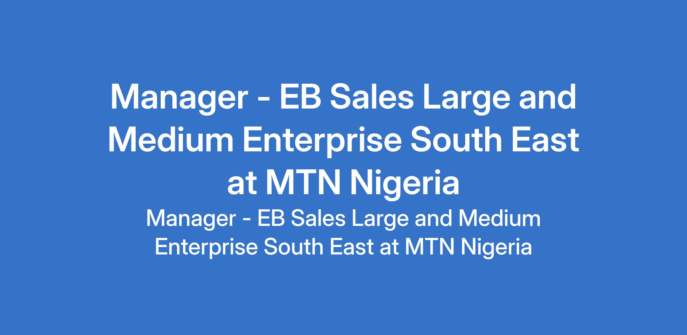 MTN Nigeria is recruiting to fill the position of: Manager - EB Sales Large and Medium Enterprise South East. The position is located in Ikoyi, Lagos State. Interested candidates should possess a First Degree in any related discipline with 6 - 13 years experience.