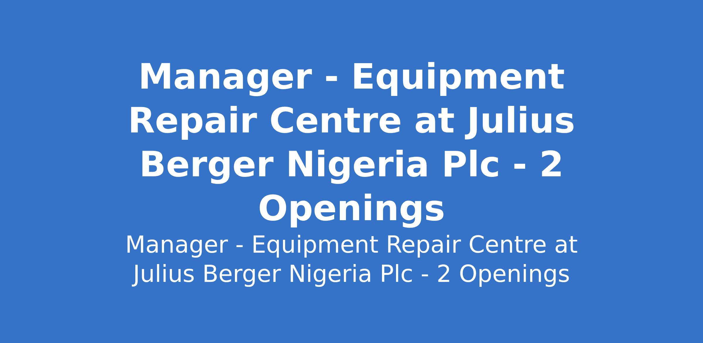 Julius Berger Nigeria Plc is recruiting to fill the position of: Manager - Equipment Repair Centre. The position is located in Abuja and Port Harcourt, Rivers State. Interested candidates should possess a Bachelors Degree in Mechanical / Automotive Engineering or similar with 5 10 years experience in heavy equipment, plant, or vehicle maintenance, including preventive and corrective work.