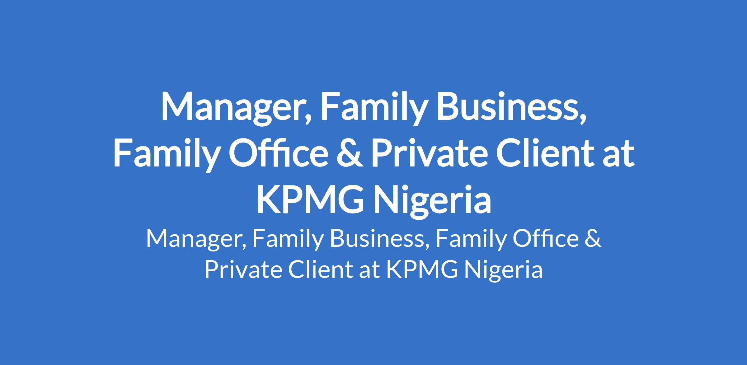 KPMG Nigeria is recruiting to fill the position of: Manager, Family Business, Family Office & Private Client. The position is located in Lagos State. Interested candidates should possess a minimum of Second-Class Upper Division / a Masters Degree in Business Administration, Management, Finance, Law, or a related field with 6-10 years in Strategy & Business Advisory.