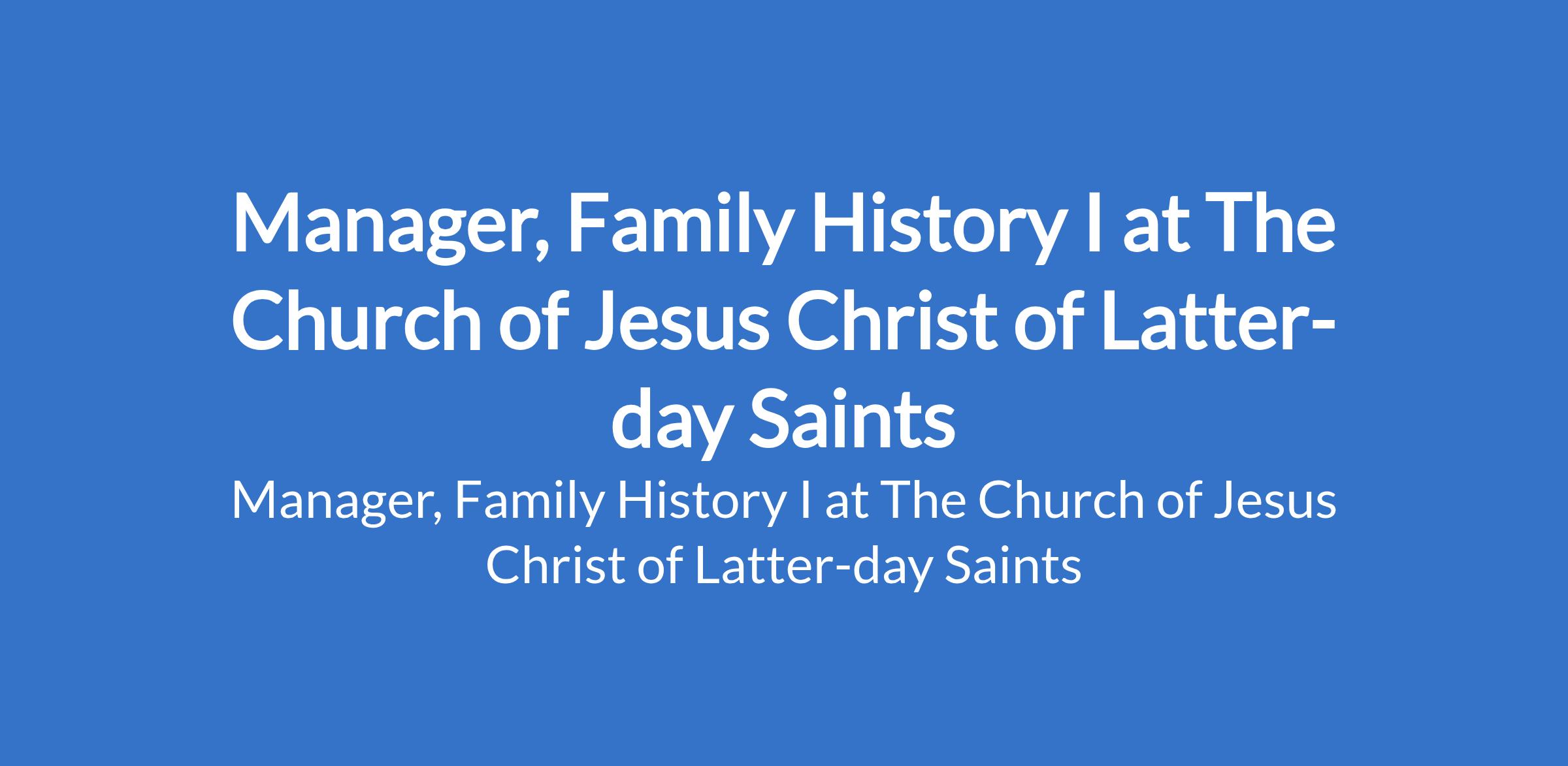 The Church of Jesus Christ of Latter-Day Saints is recruiting to fill the position of: Manager, Family History I. The position is located in Ikeja, Lagos State. Interested candidates should possess a Masters Degree in Business Administration, Management, Marketing, Information Technology, History, Sociology, Anthropology, or a related field with a minimum of 8 years of relevant professional experience demonstrating a strong track record and must be a member of The Church of Jesus Christ of Latterday Saints in Nigeria and worthy of a current temple recommend.