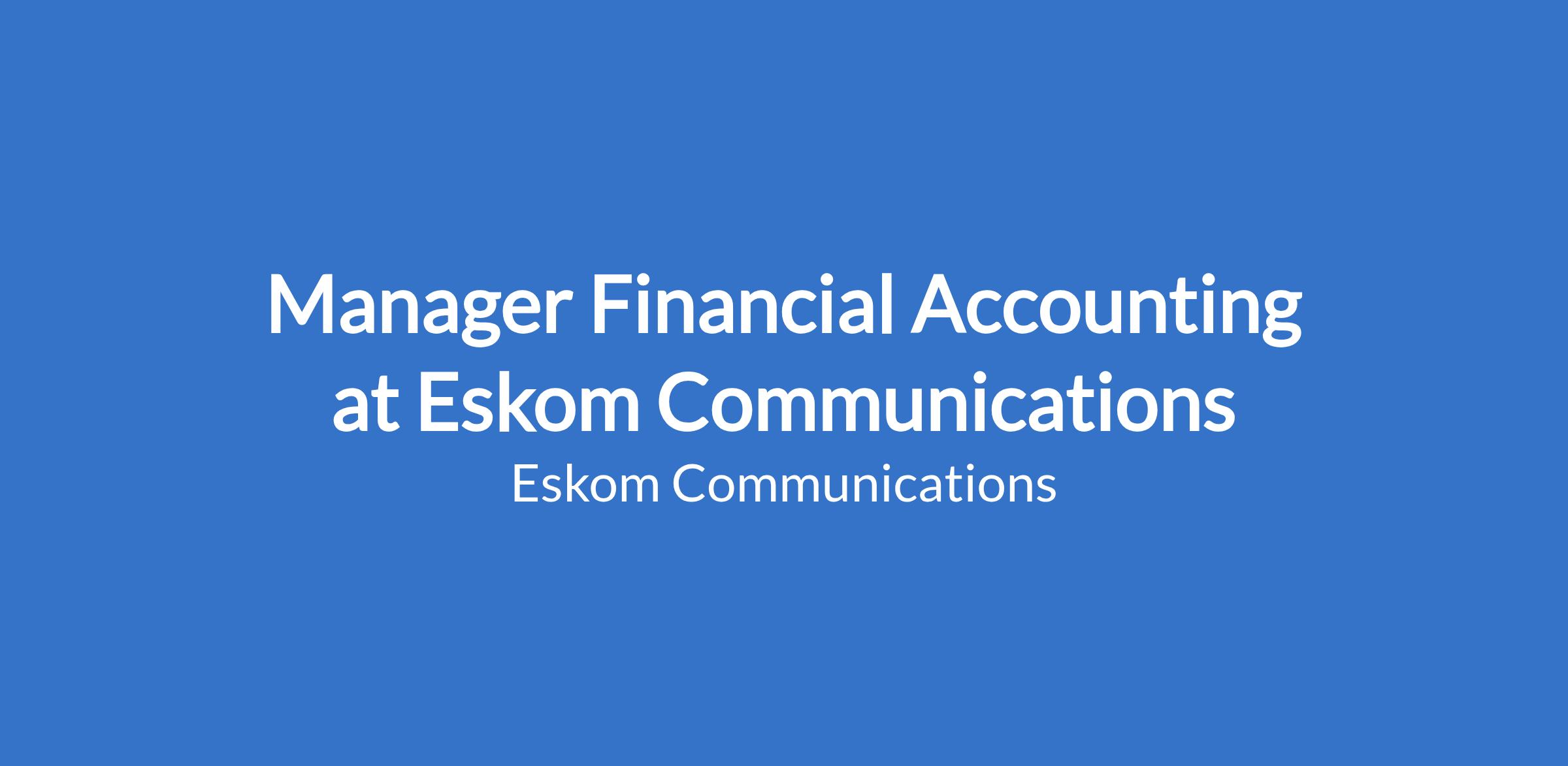 Position: Manager Financial Accounting Position/Task Grade: M15 Area of specialization: To manage financial accounting for the finance business centre (FBC) site, provide a management and advisory service to maintain financial discipline, data quality and integrity to enable accurate and reliable financial reporting and ensure process control and assurance (PCA) functions are carried out, informal assessments, collation of Public Finance Management Act (PFMA) reports and feeding risks from all relevant operational areas to process control and assurance (PCA) encompasses all governance functions. Department: Finance Business Unit: Arnot Power Station Location: Mpumalanga