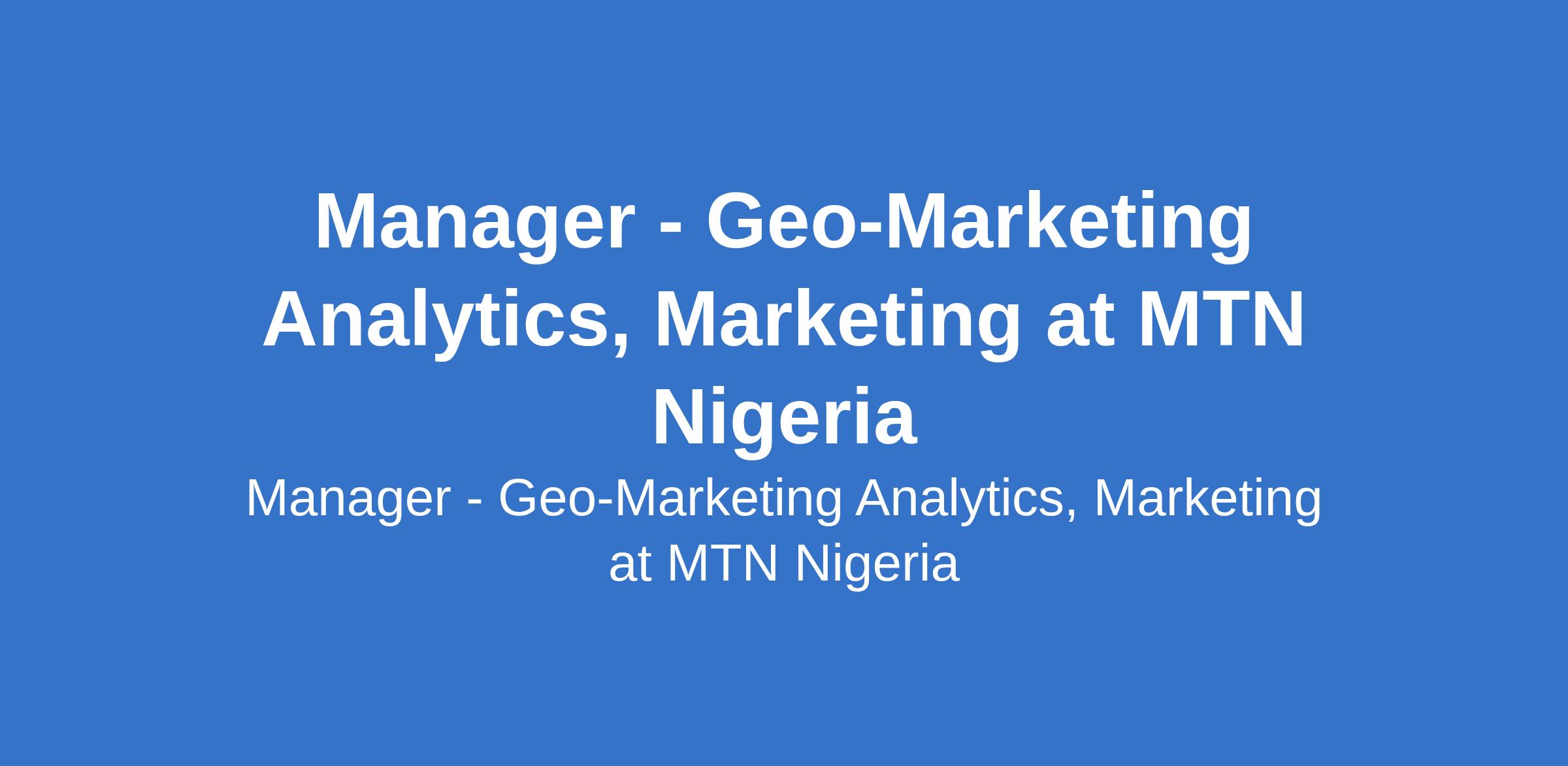 MTN Nigeria is recruiting to fill the position of: Manager - Geo-Marketing Analytics, Marketing. The position is located in Lagos State. Interested candidates should possess a First Degree in Computer Science, Information Systems Management, Statistics, Mathematics, Data Science, Analytics, Business, or any related discipline, complemented by relevant professional experience and appropriate onthejob training with 613 years experience.