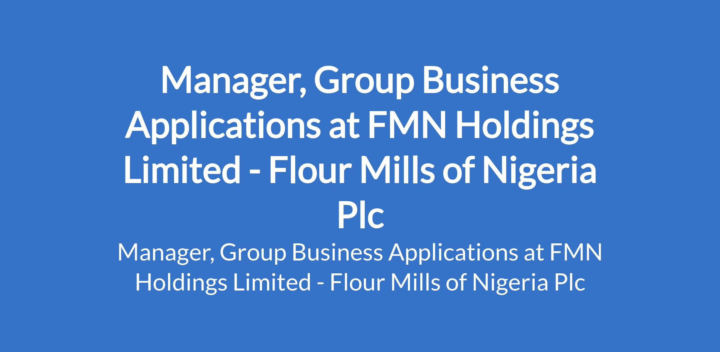FMN Holdings Limited, a subisidiary of Flour Mills of Nigeria Plc is recruiting to fill the position of: Manager, Group Business Applications. Interested candidates should possess a Bachelors Degree in Computer Science, Information Technology, or Business Management with 1012 years progressive experience in Information Technology or ERP systems.