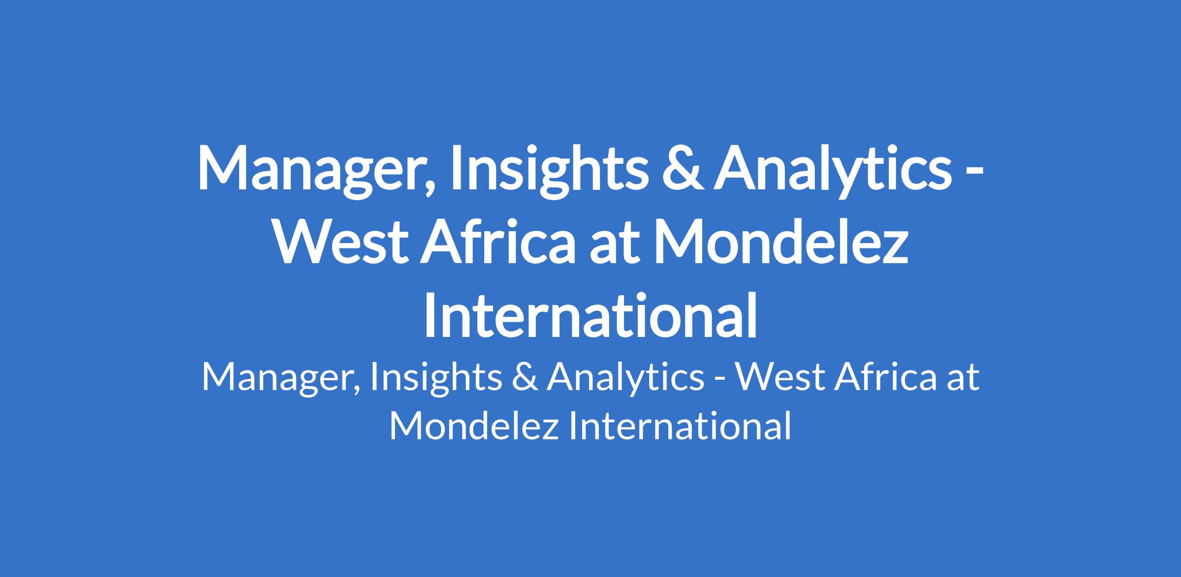 Mondelez International is recruiting to fill the position of: Manager, Insights & Analytics - West Africa. The position is located in Lagos State. Interested candidates should possess relevant qualifications with a minimum of 6 years working experience in commercial area (preferably FMCG).