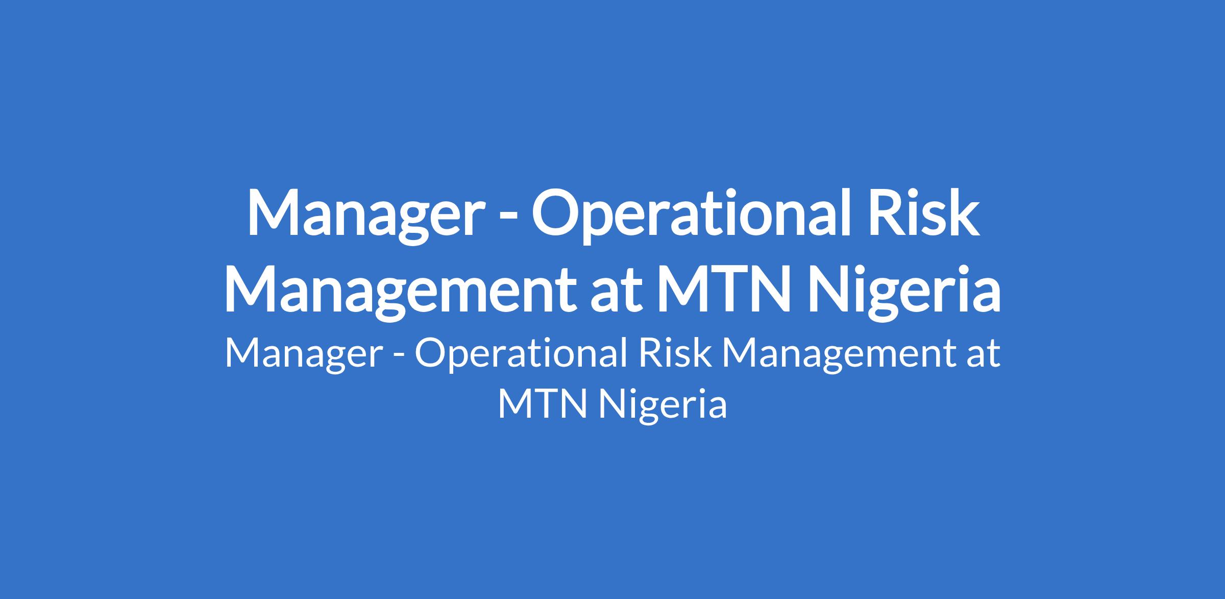 MTN Nigeria is recruiting to fill the position of: Manager - Operational Risk Management. The position is located in Ikoyi, Lagos State. Interested candidates should possess a Bachelors Degree in Business, Finance, Accounting, Engineering, Computer Science, Economics or related disciplines with 6 - 13 years experience.