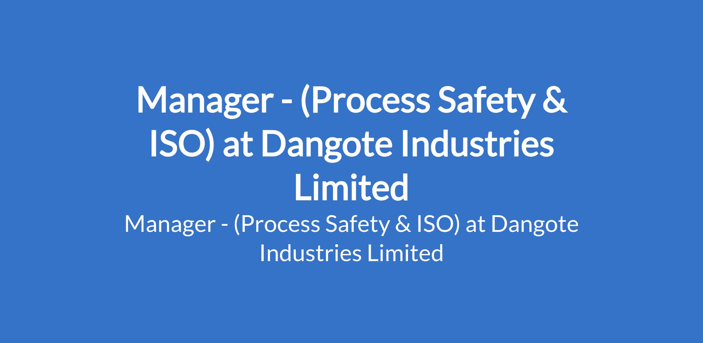 Dangote Industries Limited is recruiting to fill the position of: Manager - (Process Safety & ISO). Interested candidates should possess a Bachelor's Degree in Chemical or Process Safety Engineering with 5-7 years of experience working in the chemical process industry as a process safety engineer.