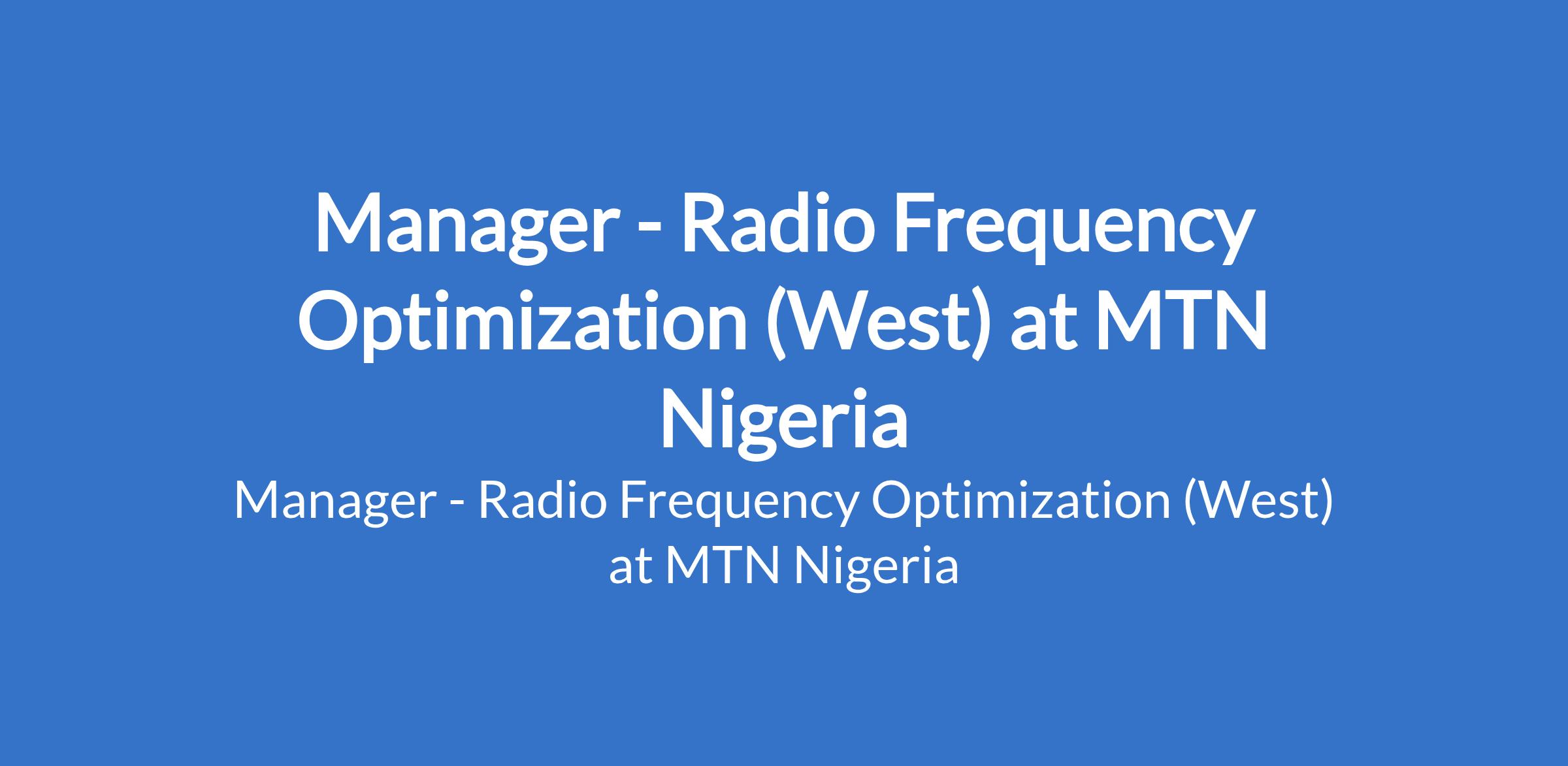 MTN Nigeria is recruiting to fill the position of: Manager - Radio Frequency Optimization (West). The position is located in Ibadan, Oyo State. Interested candidates should possess a First Degree in Elect / Elect, Computer Sc. / Engineering or Project Management with 6 - 13 years experience.