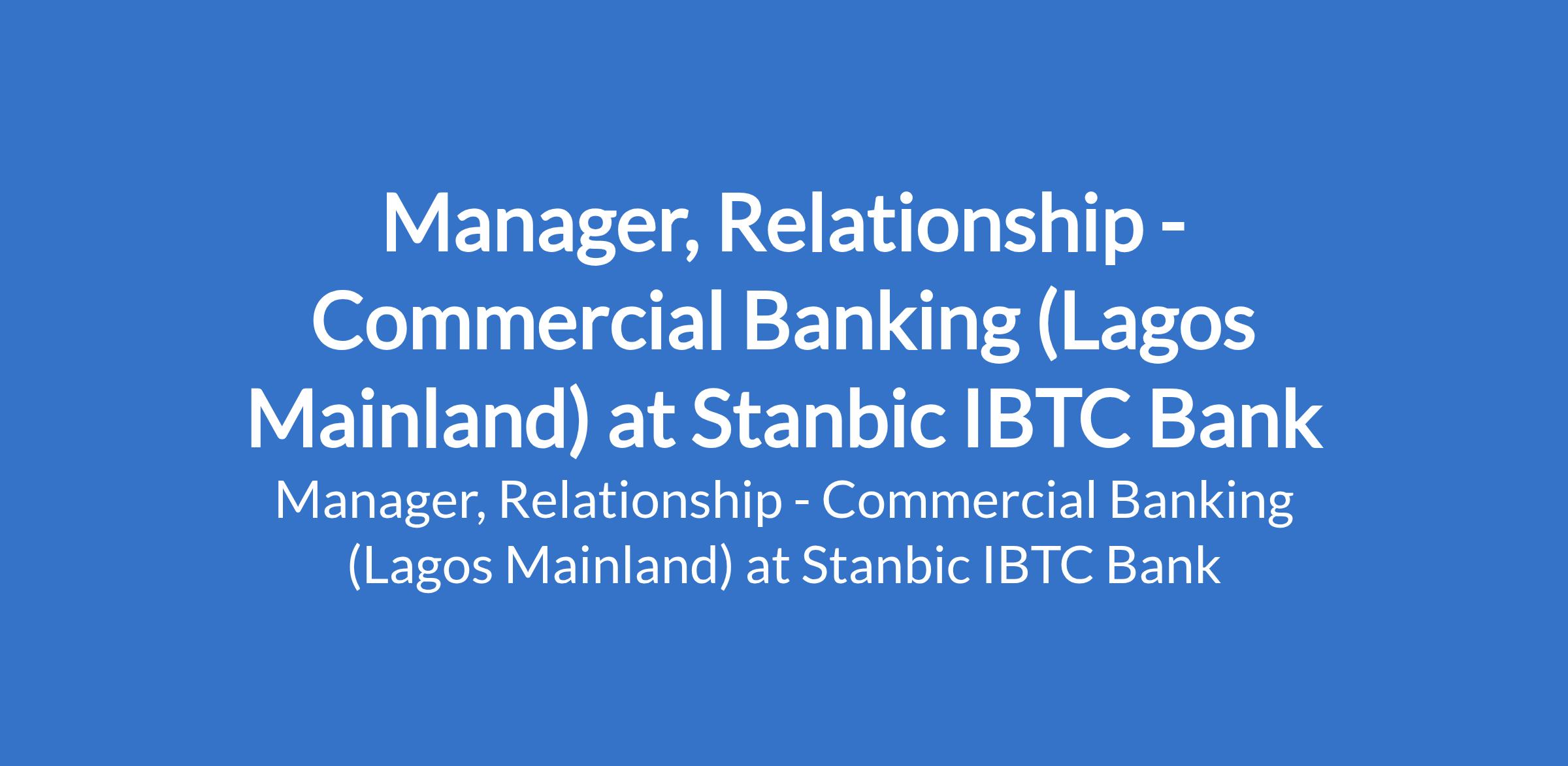 Stanbic IBTC Bank is recruiting to fill the position of: Manager, Relationship - Commercial Banking. The position is located in Lagos Mainland, Lagos State. Interested candidates should possess a First Degree with 7 - 10 years relationship management experience in a commercial Bank.