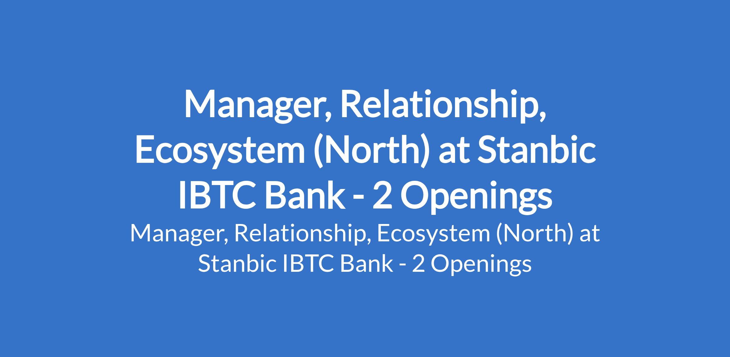 Stanbic IBTC Bank is recruiting to fill the position of: Manager, Relationship, Ecosystem (North). The position is located in Lagos Mainland - Lagos & Zaria - Kaduna States. Interested candidates should possess a First Degree with 7 - 10 years experience in in relationship management and sales.