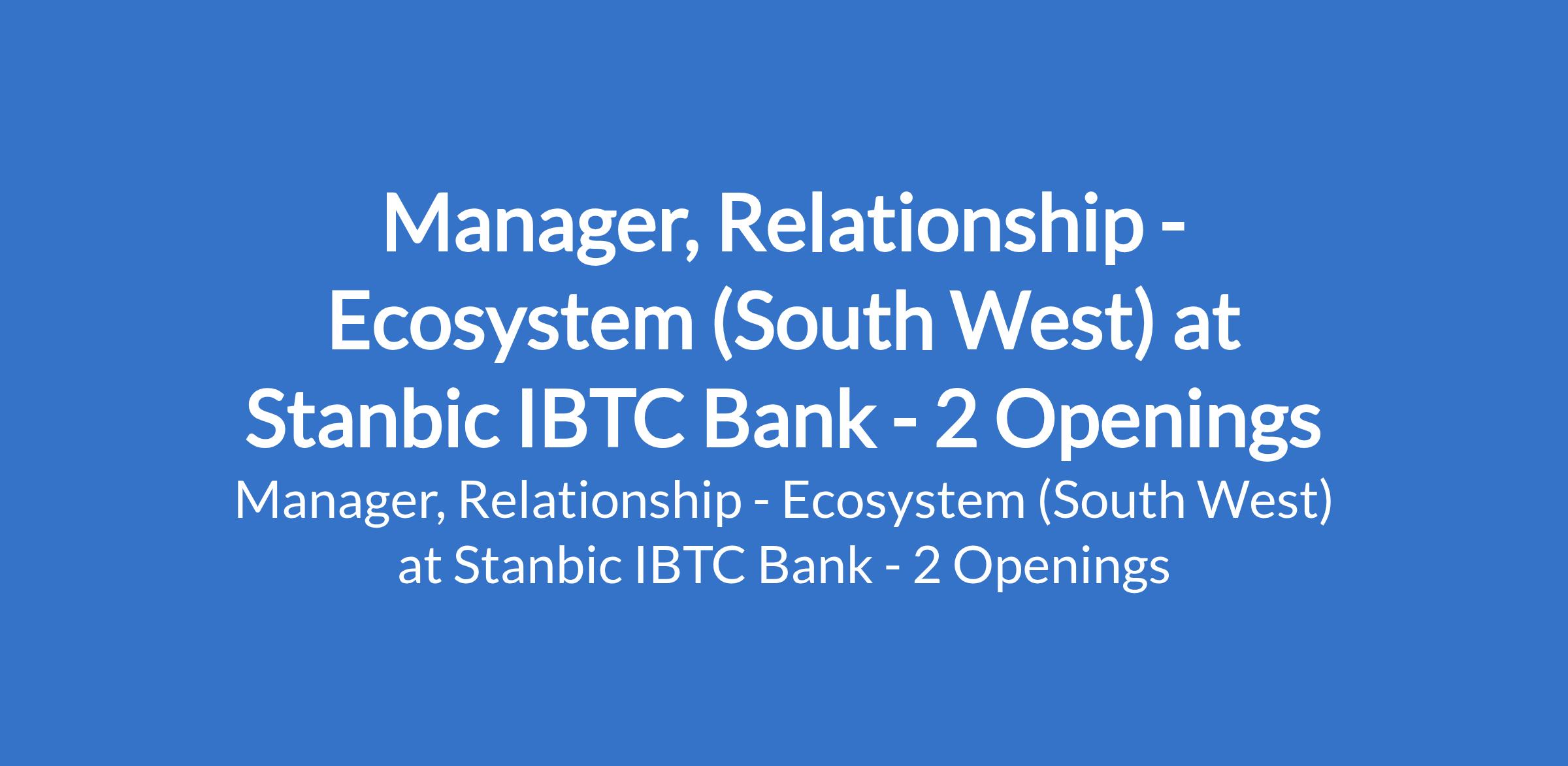 Stanbic IBTC Bank is recruiting to fill the position of: Manager, Relationship - Ecosystem (South West). The position is located in Lagos Mainland - Lagos and Ibadan, Iwo road - Oyo States. Interested candidates should possess a First Degree in any field with 7 - 10 years experience in in relationship management and sales.