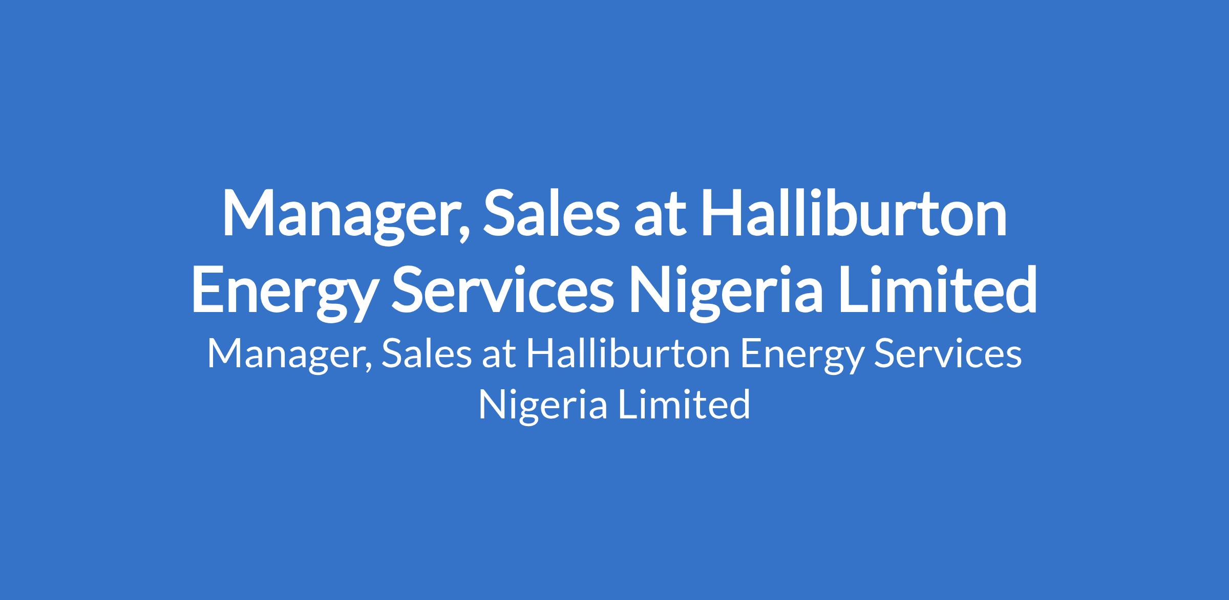 Halliburton Energy Services Nigeria Limited is recruiting to fill the position of: Manager, Sales. The position is located in Victoria Island, Lagos State. Interested candidates should possess an Undergraduate Degree in Business Administration, Engineering, Science, or similar disciplines with 8 - 10 years of experience in Product Service Line (PSL) field operations, Business Development, or Engineering.