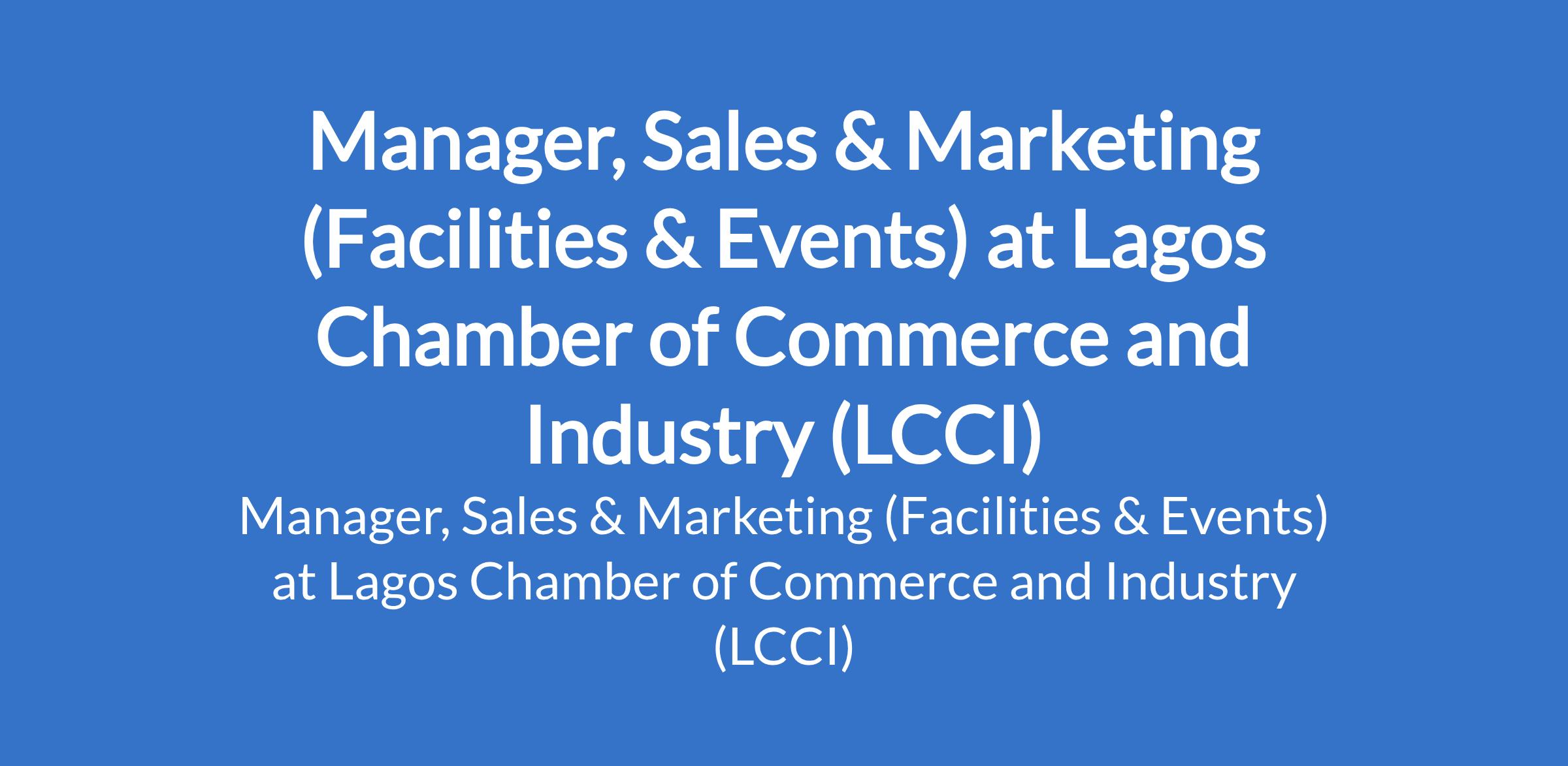 Lagos Chamber of Commerce and Industry (LCCI) is recruiting to fill the position of: Manager, Sales & Marketing (Facilities & Events). The position is located in Victoria Island & Ikeja, Lagos State. Interested candidates should possess a Bachelors Degree in Marketing, Business Administration, Hospitality Management, or related field with 8 - 10 years experience, with strong emphasis on sales and business development.