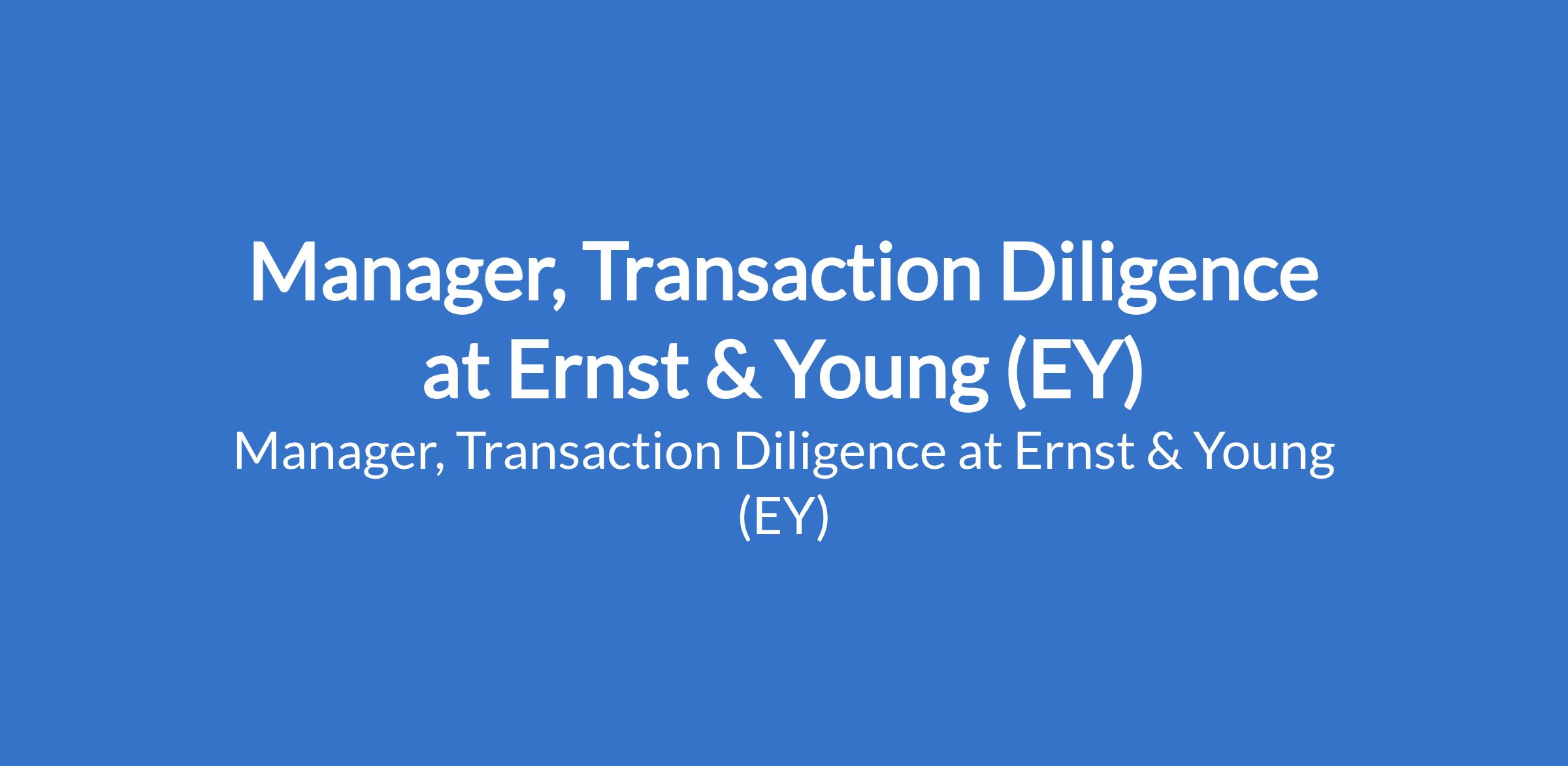 Ernst & Young (EY) is recruiting to fill the position of: Manager, Transaction Diligence. The position is located in Lagos State. Interested candidates should possess a Bachelor's or Master's Degree in Accounting and/or related major; CPA or CA, CPA certification with a minimum 10 years of accounting experience.