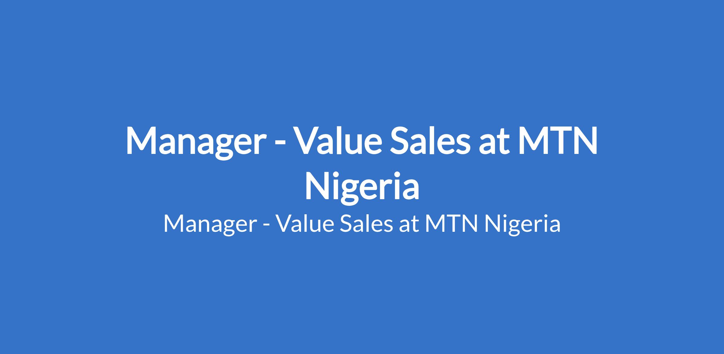 MTN Nigeria is recruiting to fill the position of: Manager - Value Sales. The position is located in Victoria Island, Lagos State. Interested candidates should possess a First Degree in any related discipline with 6 - 13 years experience.