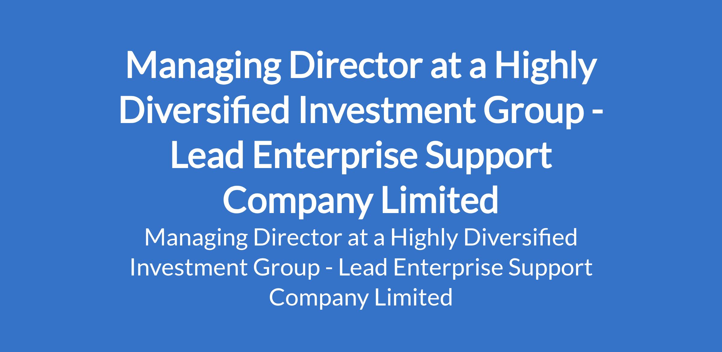 Lead Enterprise Support Company Limited - Our client, a Highly Diversified Investment group is recruiting to fill the position of: Managing Director. The position is located in Alausa - Ikeja, Lagos State. Interested candidates should possess minimum of a Masters Degree (MBA preferred) with 10 - 15 years of relevant experience.