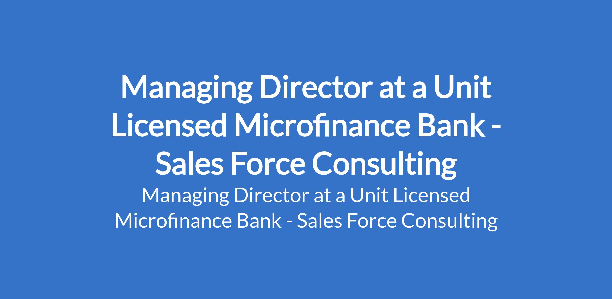 Sales Force Consulting - Our client, a Unit Licensed Microfinance Bank is recruiting to fill the position of: Managing Director. The position is located in Ubulu-Uku, Delta State. Salary: N250,000 - N350,000 per month. Interested candidates should possess a First Degree / HND in any course but preferably, Accounting, Banking and Finance, Statistics, Economics and the Social Sciences. Professional qualification will be an added advantage and candidate must have undergone the Microfinance Certification Program and obtained a Certificate in Microfinance Banking issued by the Chartered Institute of Bankers of Nigeria (CIBN) with a minimum of 12 years of work experience in financial services, most of which must be in a renowned MFB.