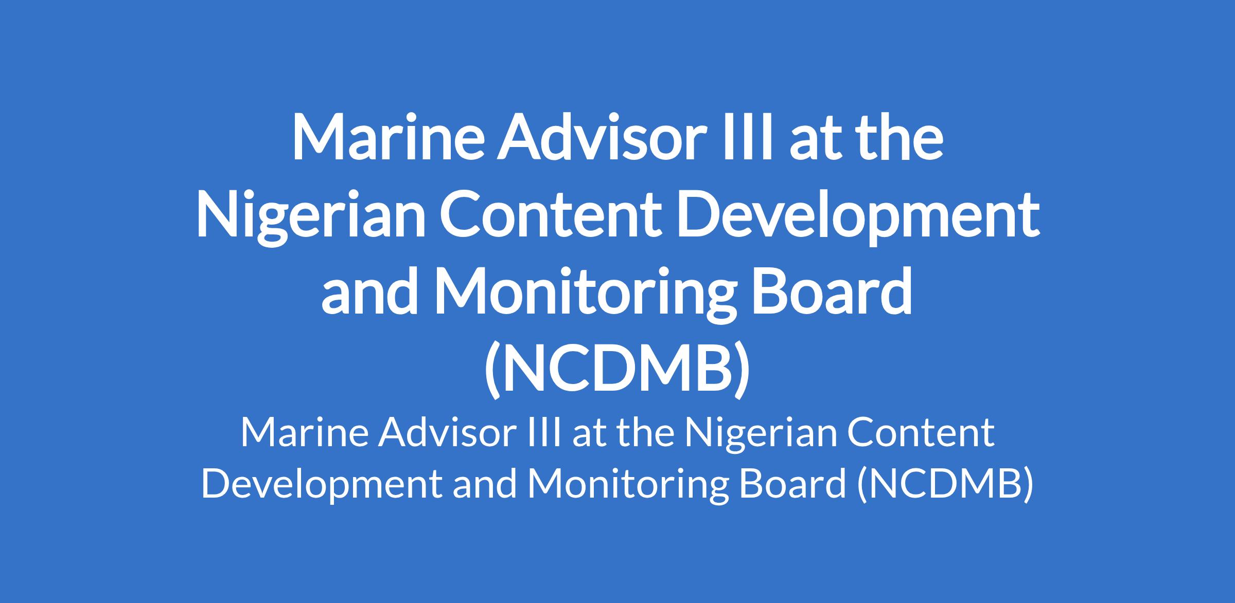 The Nigerian Content Development and Monitoring Board (NCDMB) is recruiting to fill the position of: Marine Advisor III. Interested candidates should possess a Bachelor's Degree in Marine Engineering, Nautical Science, or related discipline; Master Mariner or equivalent marine certification is an advantage with a minimum of 16 years experience in offshore zmarine operations within oil & gas industry.
