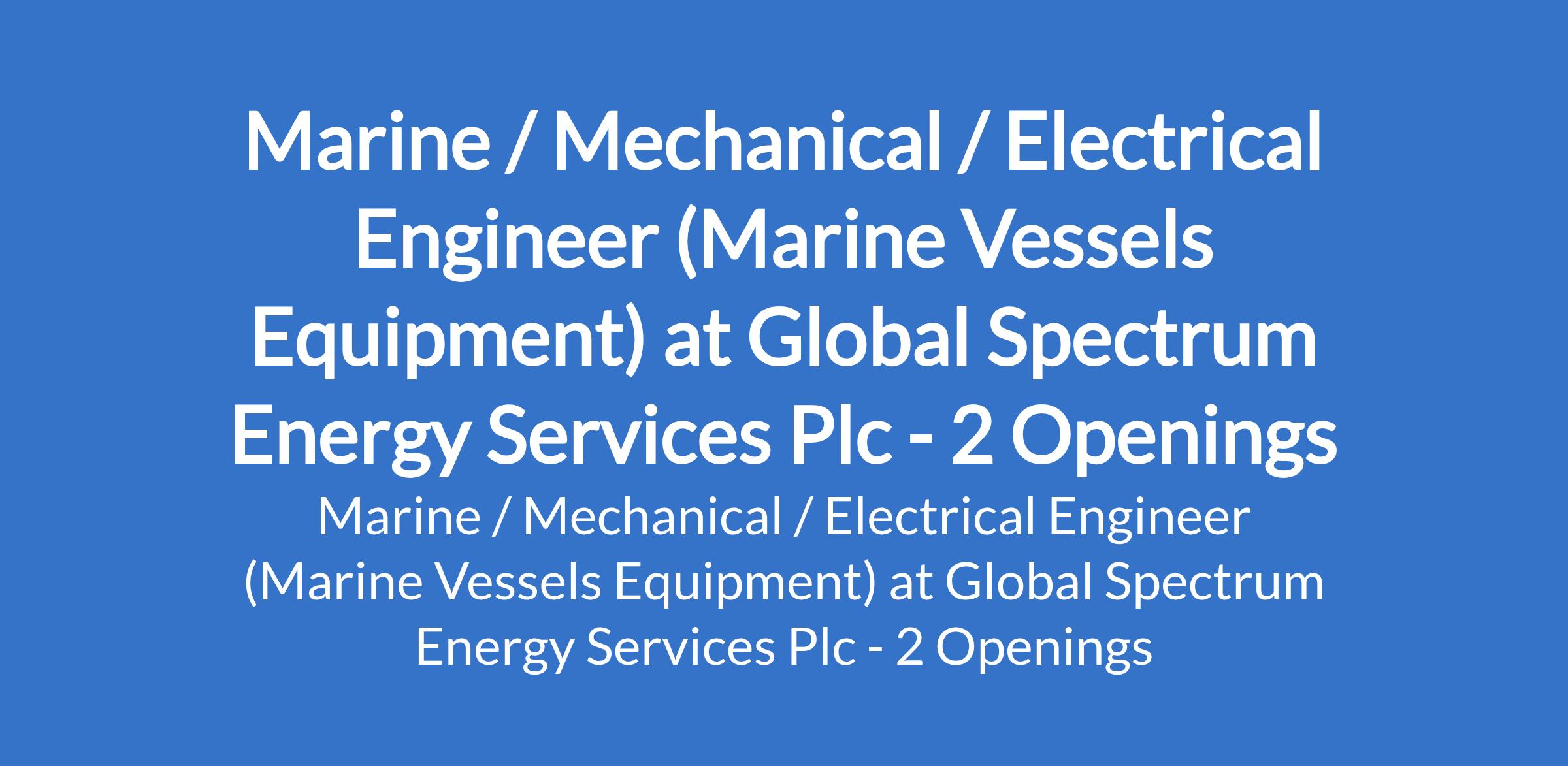 Global Spectrum Energy Services Plc is recruiting to fill the position of: Marine / Mechanical / Electrical Engineer (Marine Vessels Equipment). The position is located in Abuja (FCT) and Port Harcourt - Rivers State. The successful candidate will be responsible for the operation, maintenance, and repair of marine vessel machinery and systems, including engines and auxiliaries, with specific expertise in Caterpillar (CAT) and Detroit Diesel engine systems. Interested candidates should possess a Bachelors Degree in Marine, Mechanical, or Electrical Engineering with a minimum of ten (10) years hands-on experience on marine vessels.