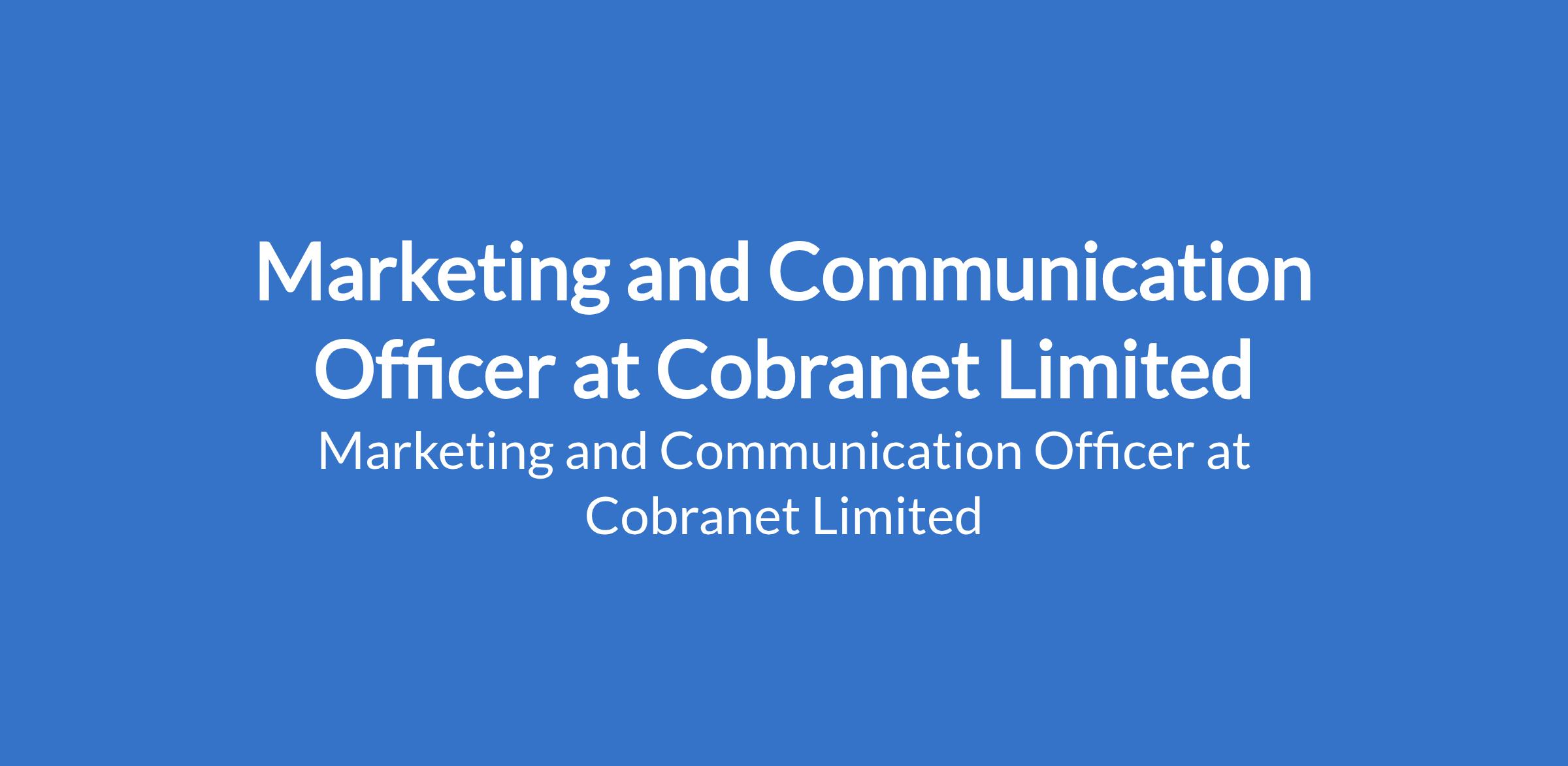 Cobranet Limited is recruiting to fill the position of: Marketing and Communication Officer. The position is located in Lekki Phase 1, Lagos State. Interested candidates should possess a Minimum of a Bachelors Degree or its equivalent in Marketing, Mass Communication or any related course with a minimum of 5 years Cognate Experience as a Marketing and Communication Officer is a MUST. Experience in an ISP is an added advantage.