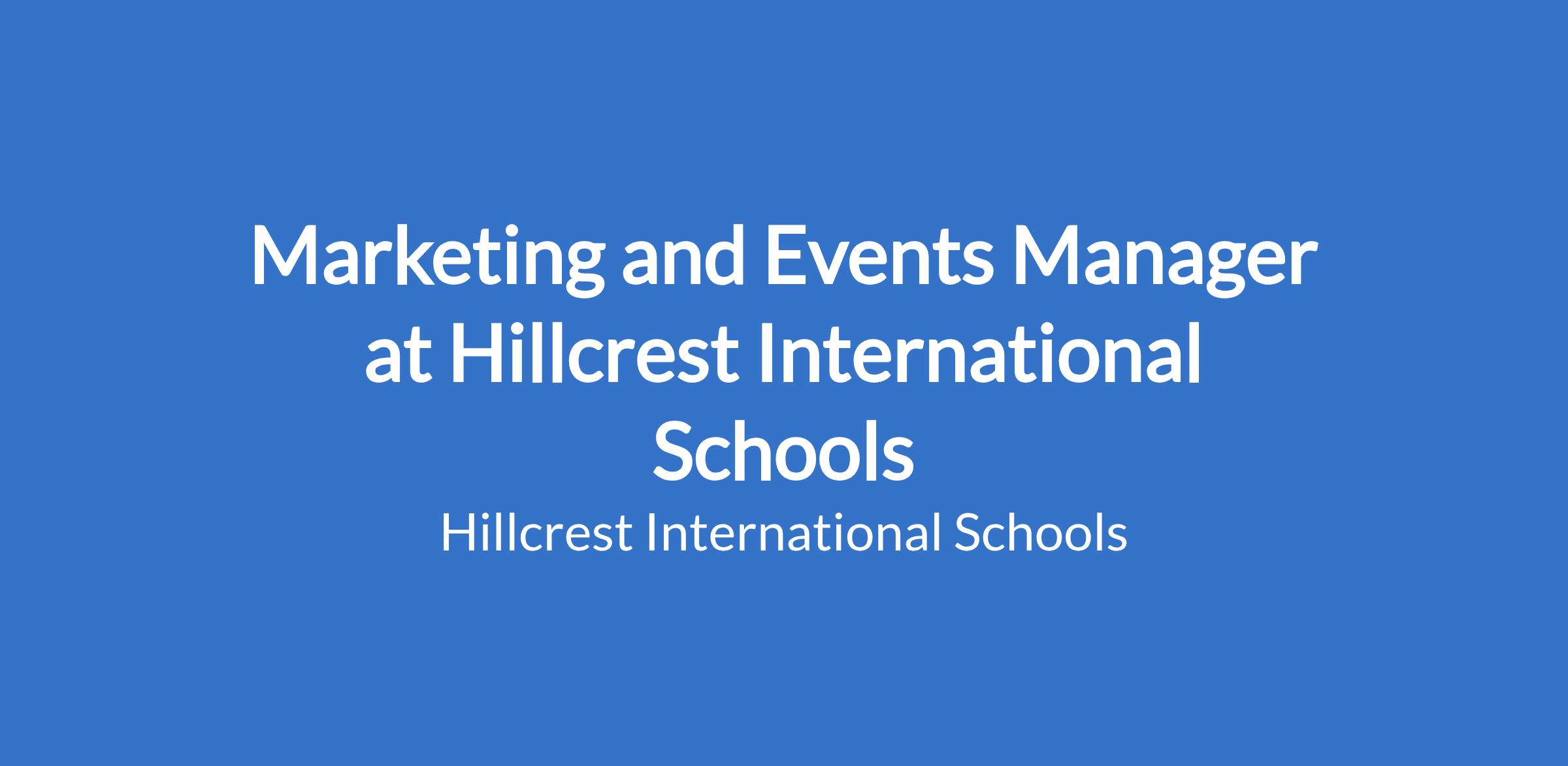 Hillcrest International School seeks to recruit a Marketing and Events Manager to lead the planning, development and delivery of the school's marketing and external engagement strategy in alignment with the Braeburn Group growth and brand frameworks.