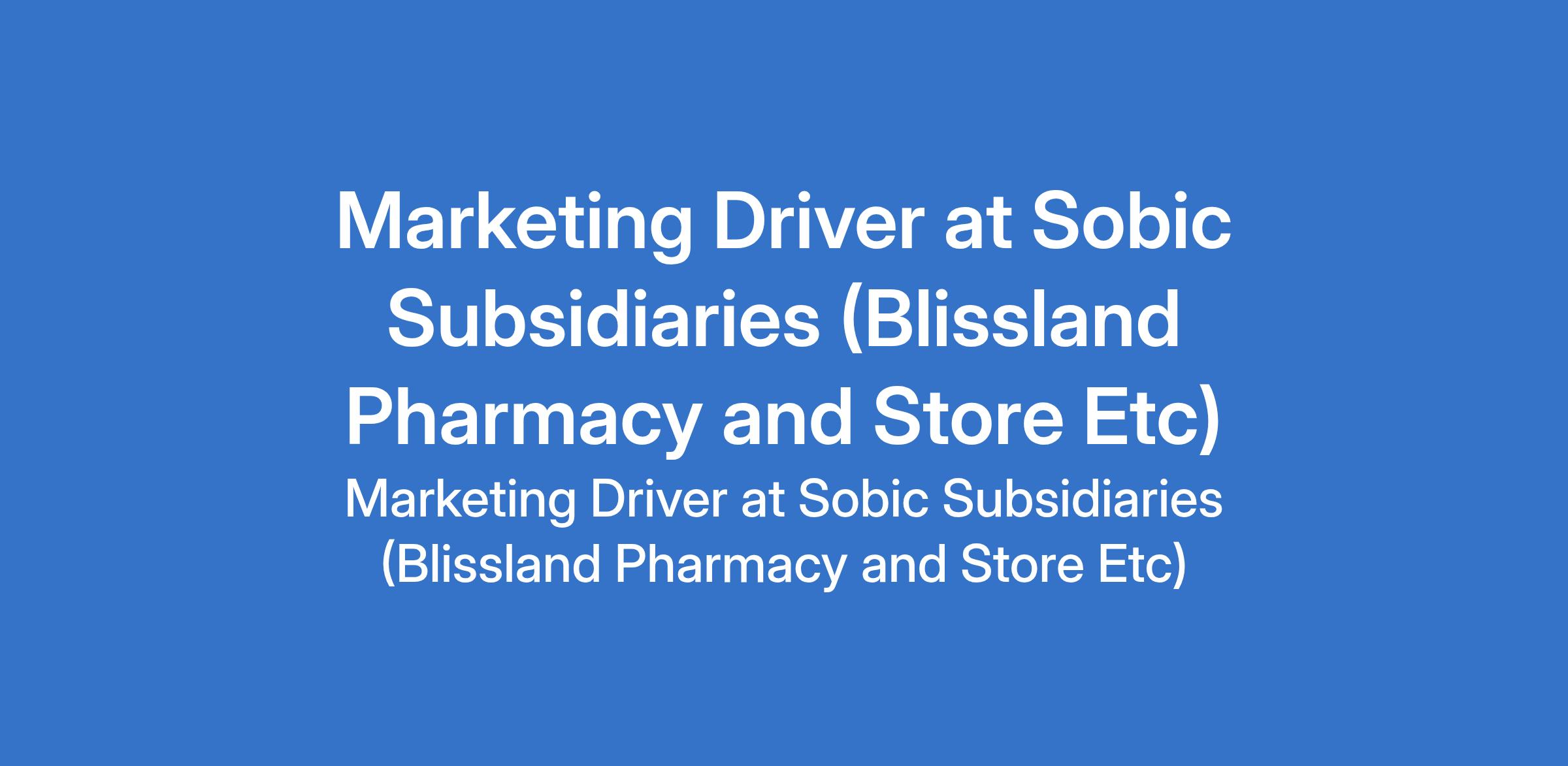 Sobic Subsidiaries (Blissland Pharmacy and Store Etc) is recruiting to fill the position of: Marketing Driver. The position is located in Alakia, Sawmill - Ibadan, Oyo State. Interested candidates should possess an HND / SSCE / OND / NCE with at least 2 years of experience.